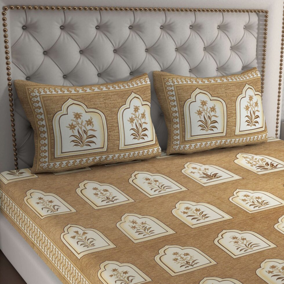 Enhance your bedroom décor with this Jaipuri Cotton Printed Double Bedsheet. Crafted from 100% pure cotton, it offers softness, breathability, and elegant traditional prints for a comfortable and stylish look. Comes with two matching pillow covers.