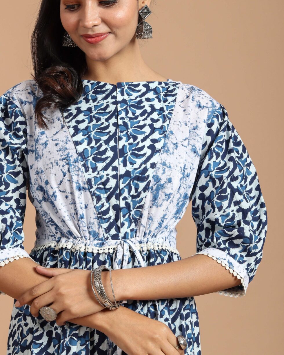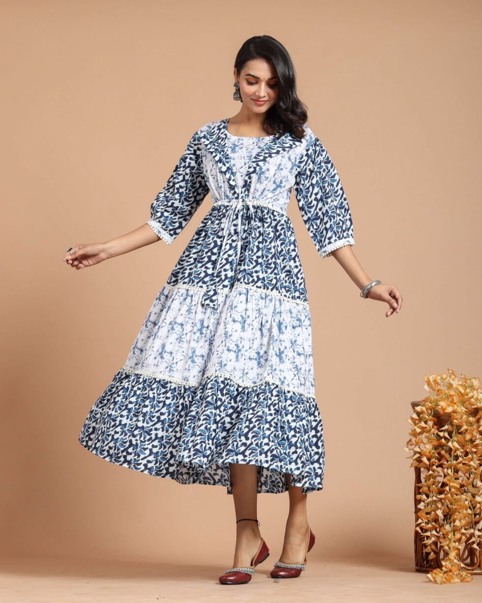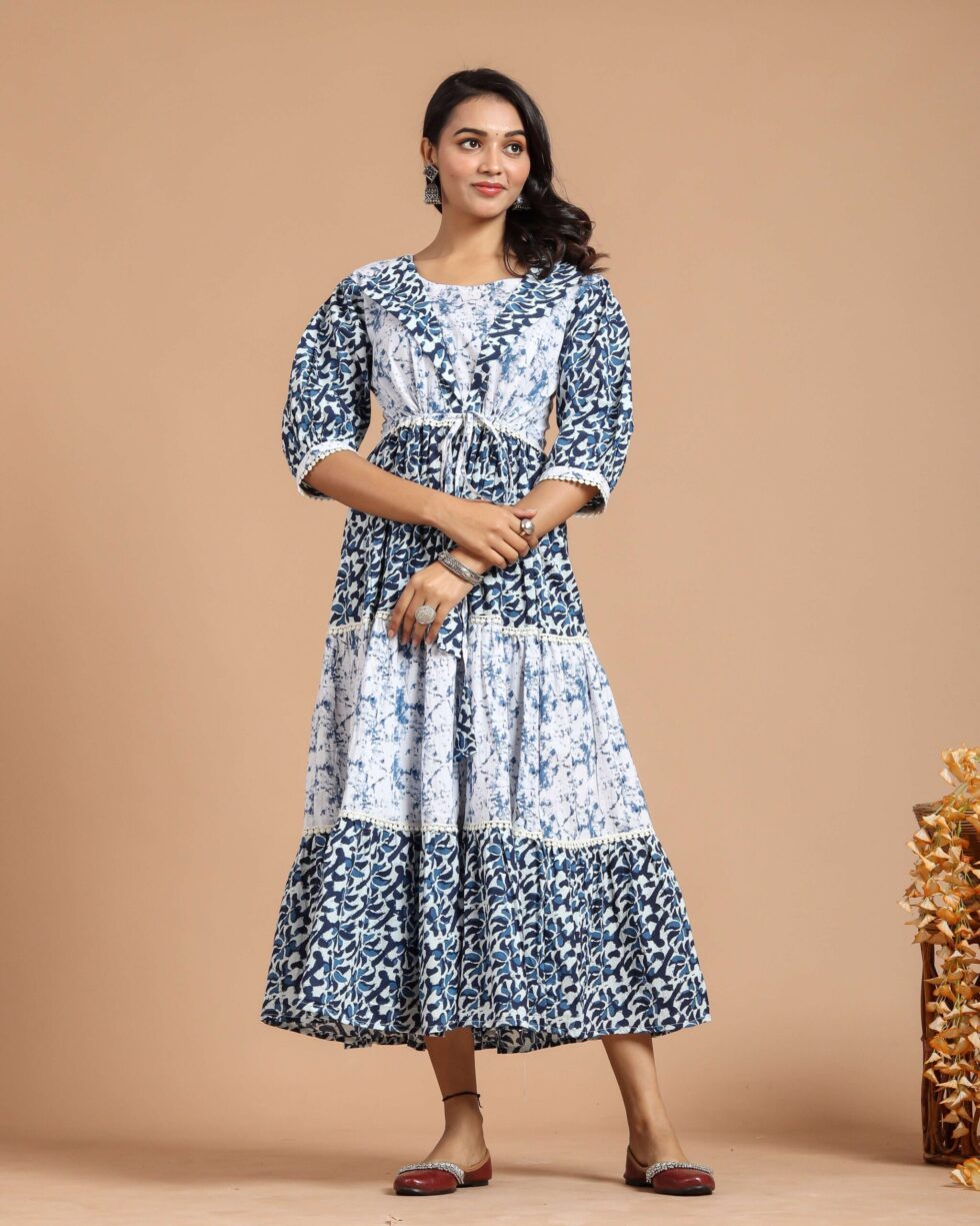 Blue & White Tiered Maxi Dress with Puff Sleeves and Tie-Up Waist