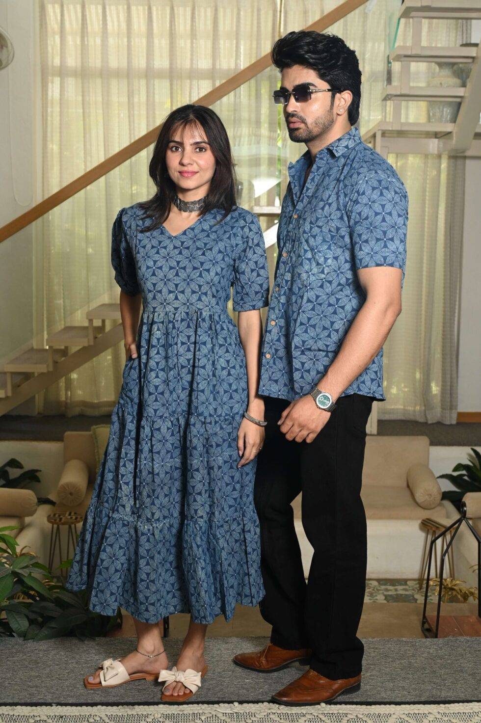 This Blue Printed couple matching outfit includes a women?s flowy cotton midi dress and a men?s short-sleeve printed shirt. Designed with cheerful floral prints, this set is perfect for summer outings, casual gatherings, or twinning on vacations.