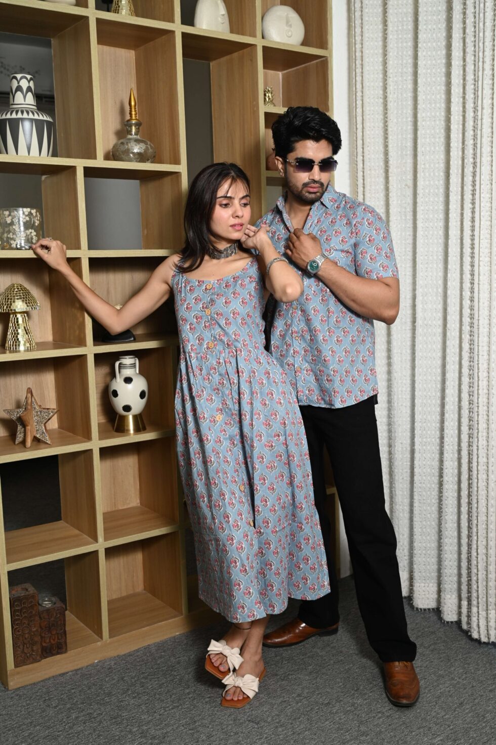 Charming couple matching outfit featuring a floral-inspired cotton dress for women and a coordinated short-sleeve shirt for men. Made from breathable cotton, perfect for vacations, parties, casual outings, and pre-wedding shoots.