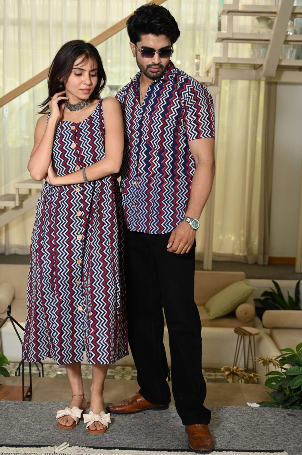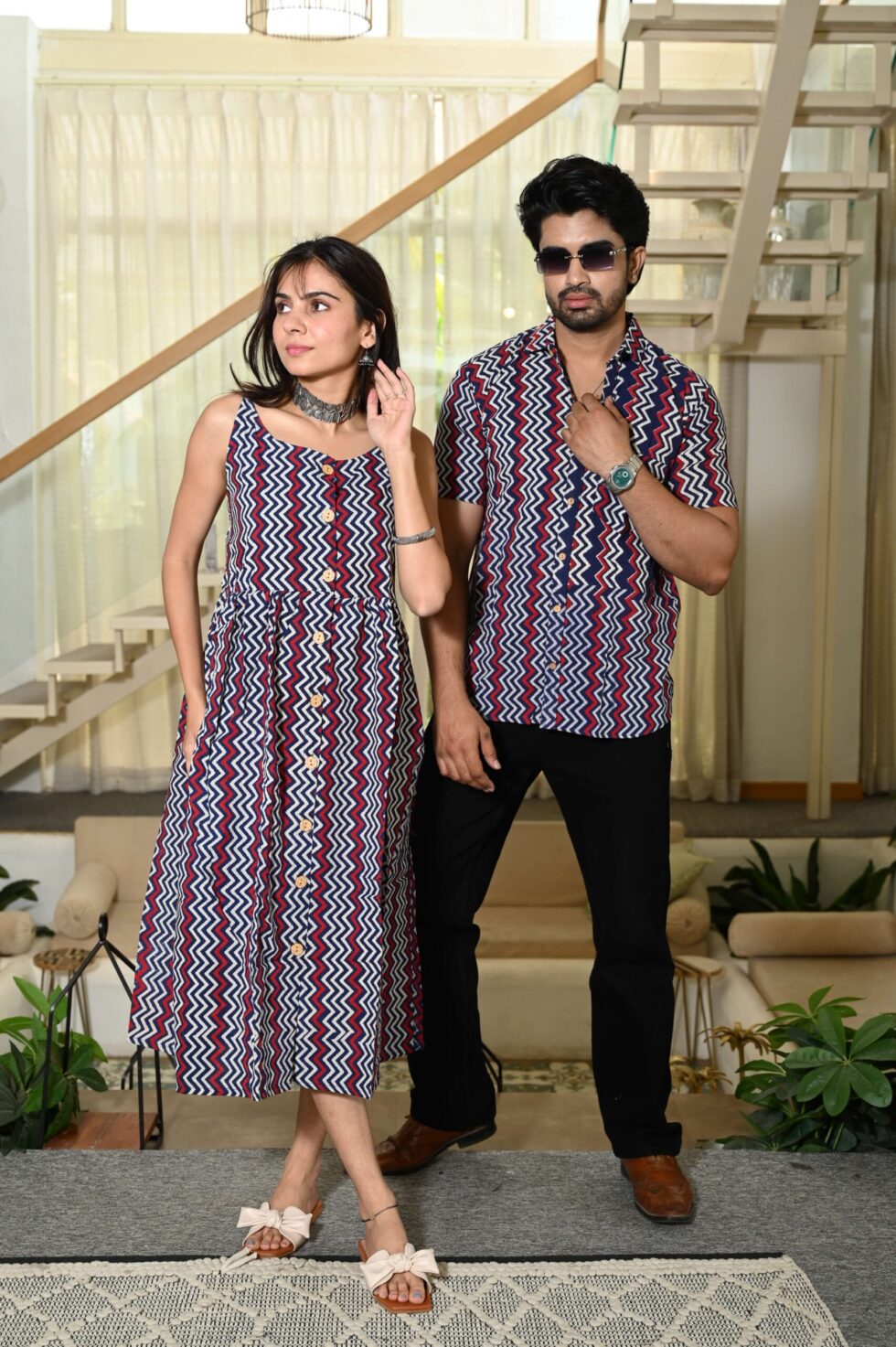 Step out in style with this charming couple matching outfit featuring a printed cotton dress for women and a coordinated short-sleeve shirt for men. Crafted from breathable cotton, this set is perfect for casual outings, vacations, parties, and pre-wedding shoots. The elegant floral-inspired print adds a touch of romance, while the soft fabric ensures all-day comfort. Pair the women?s midi dress with sandals or heels and the men?s shirt with trousers or chinos for a perfectly coordinated couple look.