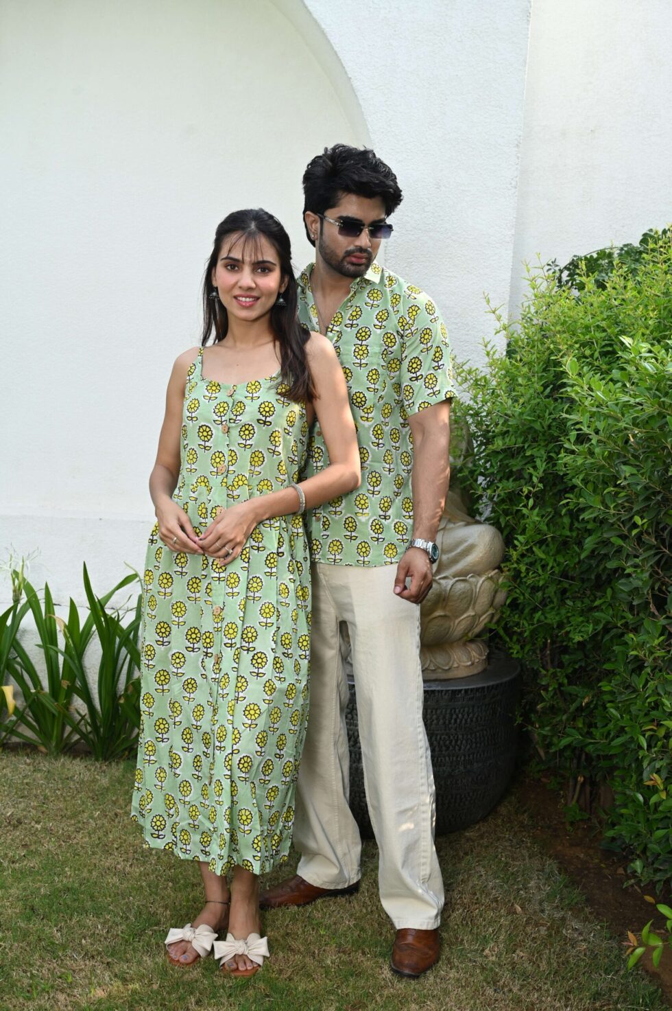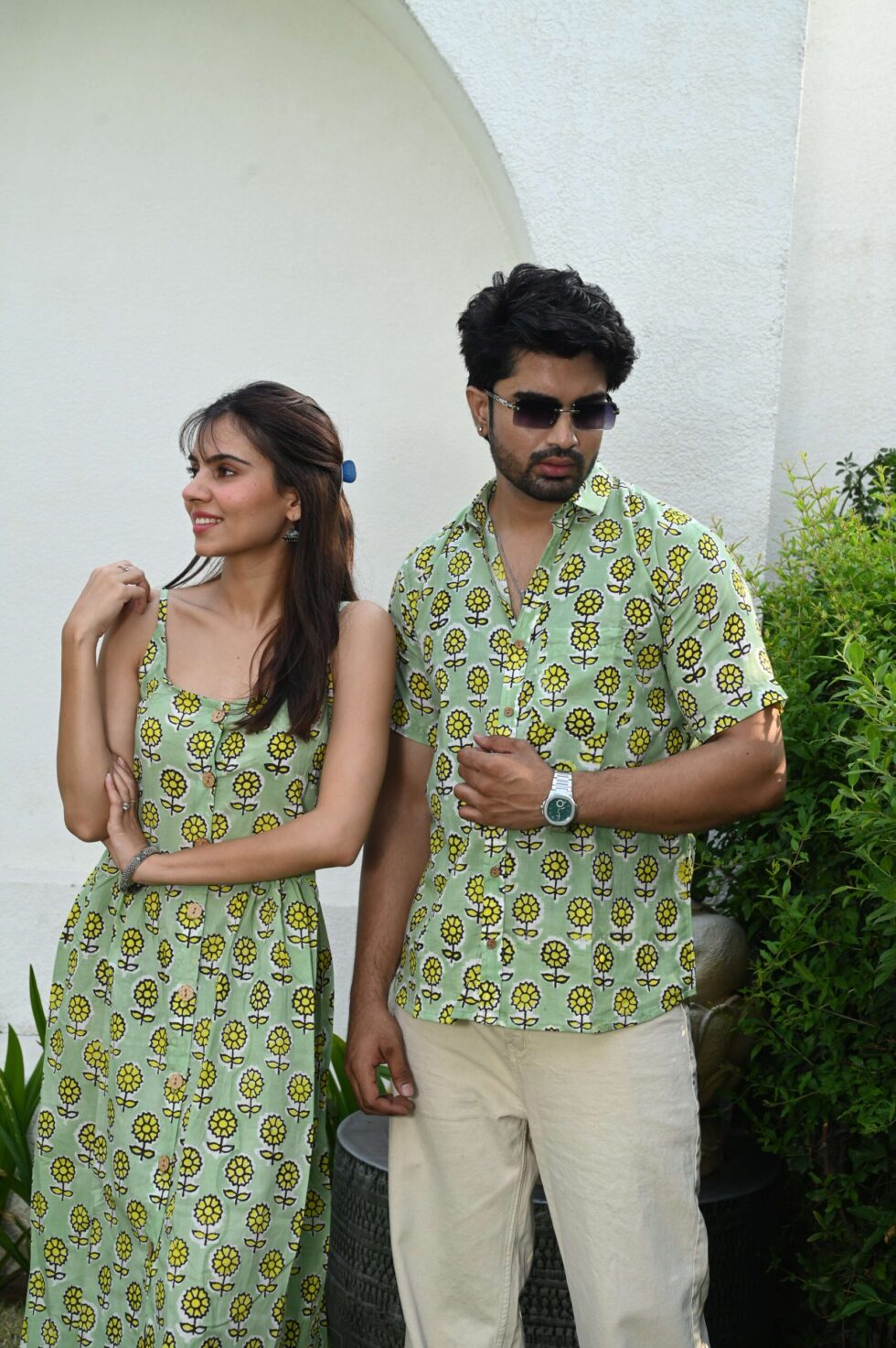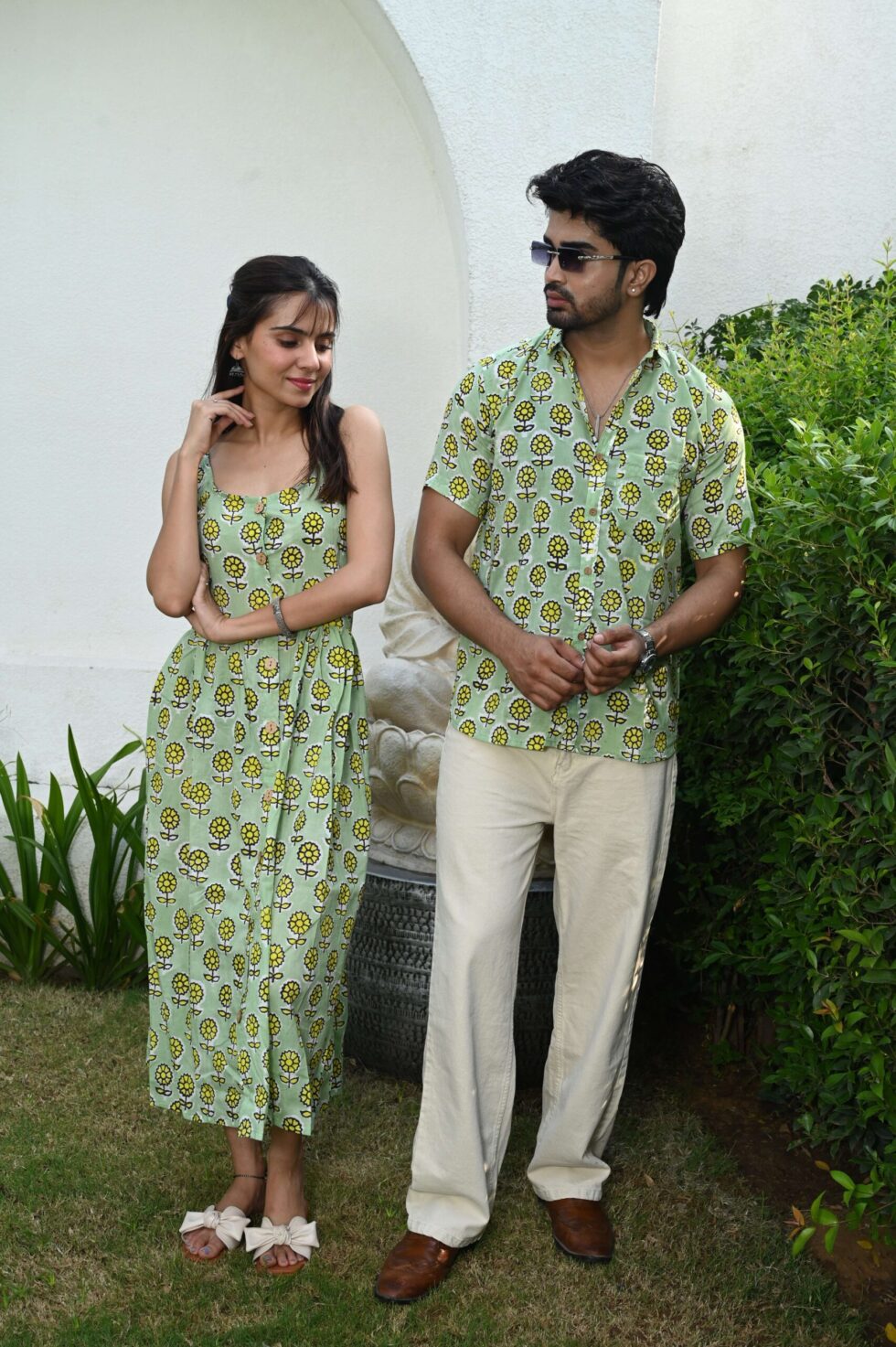 Couple Matching Outfit ? Light Green Cotton Printed Midi Dress & Shirt Set, Summer Casual Wear