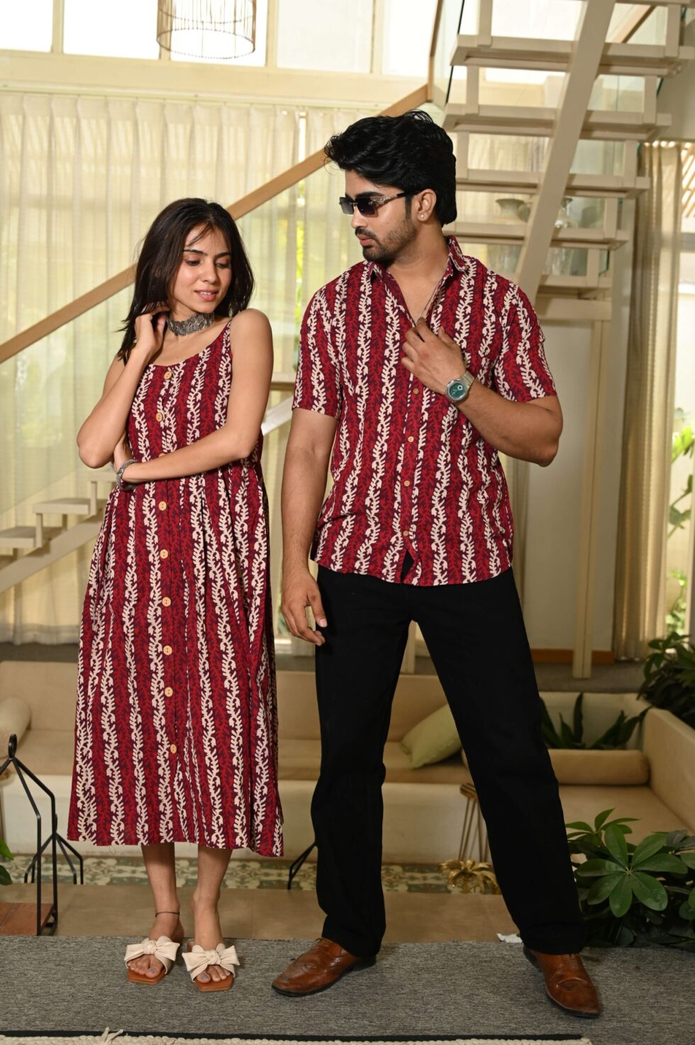 Couple Matching Outfit ? Maroon & Cream Vine Print Cotton Midi Dress & Shirt Set, Ethnic Casual Wear