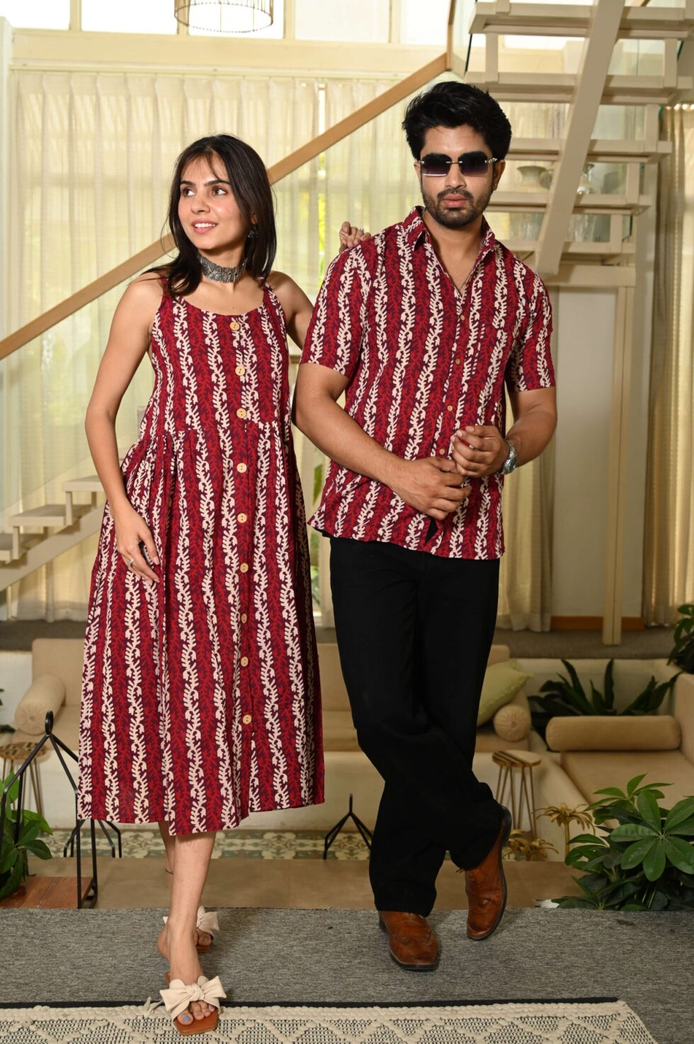 Step out in style with this charming couple matching outfit featuring a printed cotton dress for women and a coordinated short-sleeve shirt for men. Crafted from breathable cotton, this set is perfect for casual outings, vacations, parties, and pre-wedding shoots. The elegant floral-inspired print adds a touch of romance, while the soft fabric ensures all-day comfort. Pair the women?s midi dress with sandals or heels and the men?s shirt with trousers or chinos for a perfectly coordinated couple look.