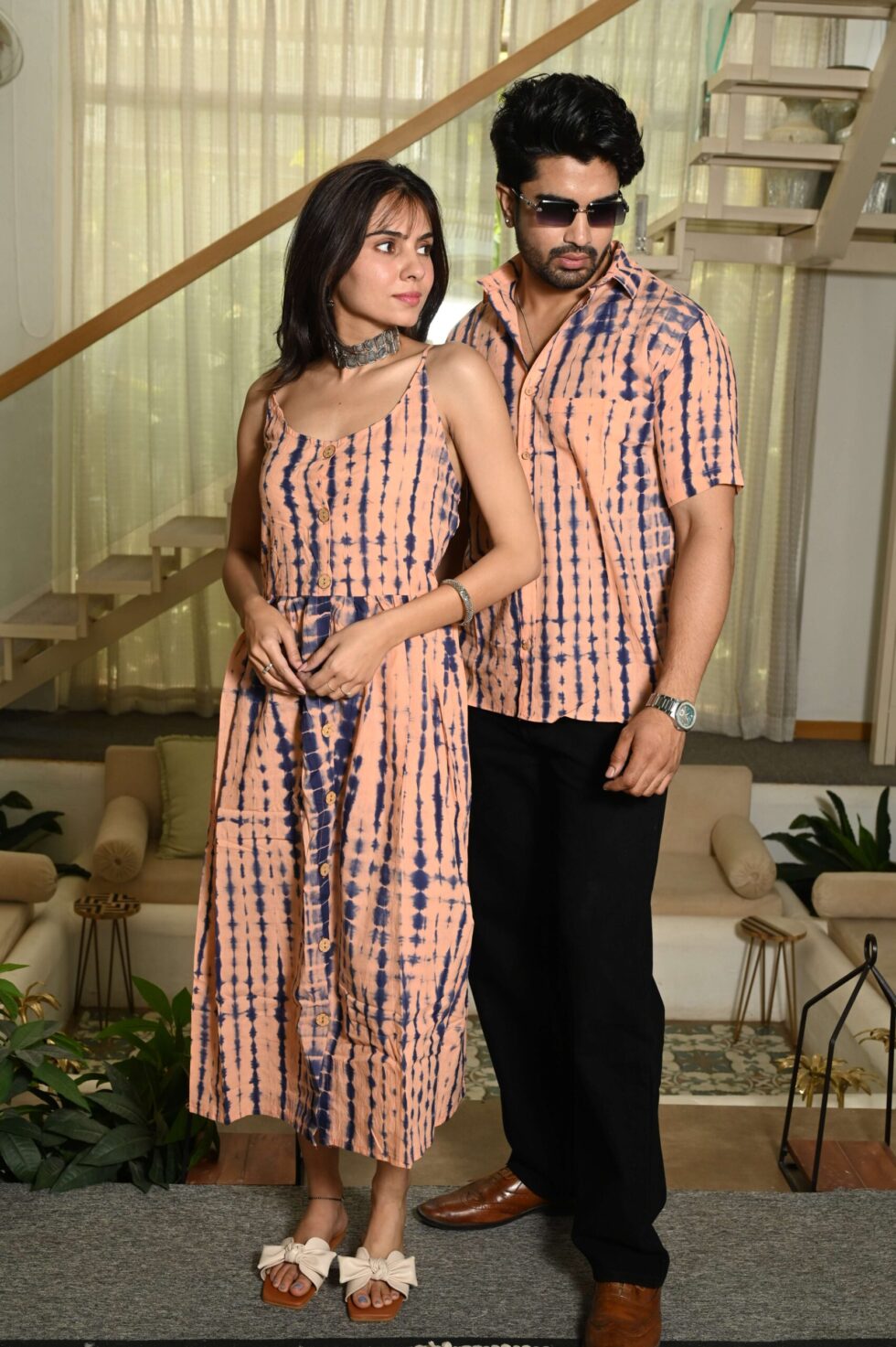 Step out in style with this charming couple matching outfit featuring a printed cotton dress for women and a coordinated short-sleeve shirt for men. Crafted from breathable cotton, this set is perfect for casual outings, vacations, parties, and pre-wedding shoots. The elegant floral-inspired print adds a touch of romance, while the soft fabric ensures all-day comfort. Pair the women?s midi dress with sandals or heels and the men?s shirt with trousers or chinos for a perfectly coordinated couple look.