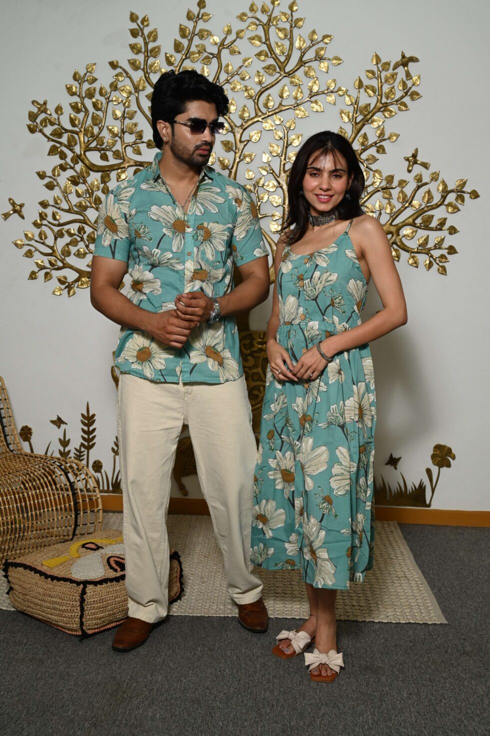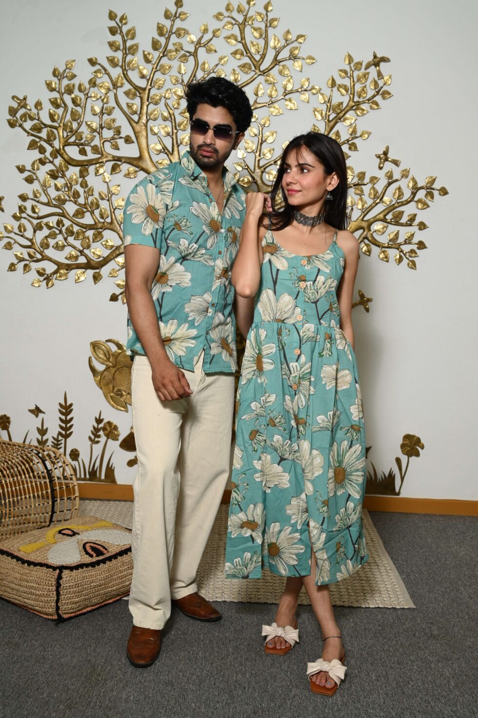 Charming couple matching outfit featuring a floral-inspired cotton dress for women and a coordinated short-sleeve shirt for men. Made from breathable cotton, perfect for vacations, parties, casual outings, and pre-wedding shoots.