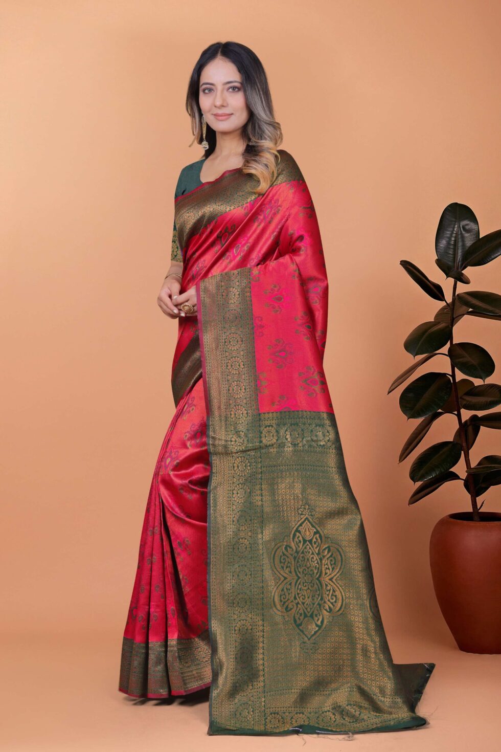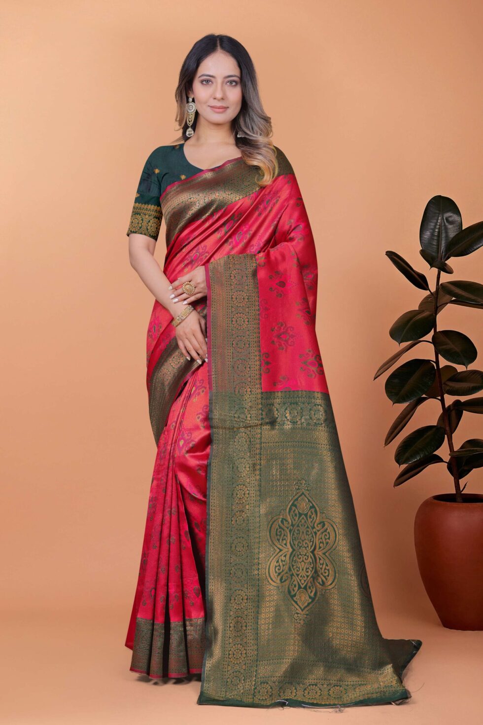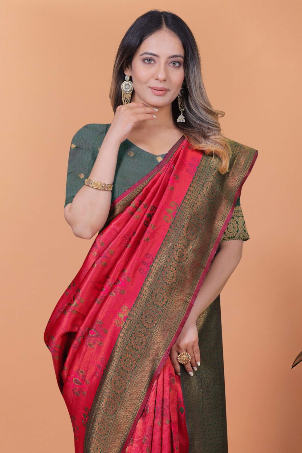 Elevate your festive wardrobe with the Crimson Majesty Banarasi Silk Saree in vibrant cherry red and bottle green, featuring intricate floral zari motifs, a grand green-gold border, and a regal woven pallu. Comes with a matching unstitched blouse, perfect for weddings, celebrations, and traditional ceremonies.