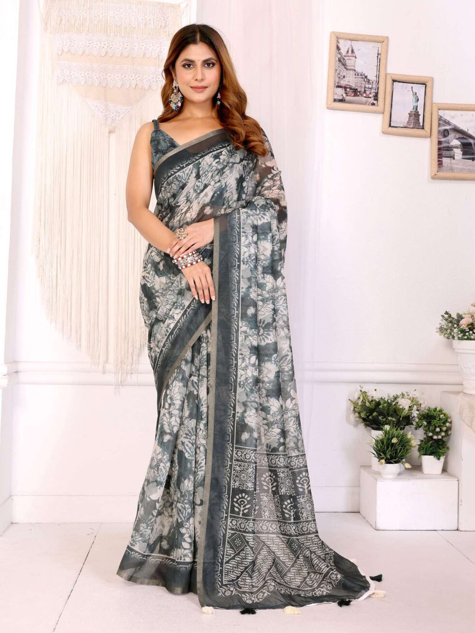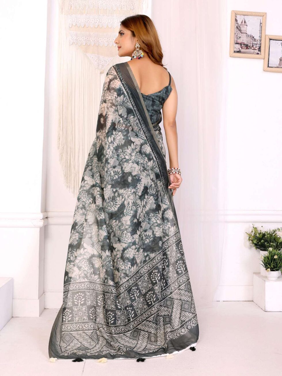Step into elegance with this Elegant White Chanderi Saree, crafted from soft, lightweight Chanderi fabric. The saree showcases a sophisticated combination of grey-black floral digital prints and traditional ethnic motifs, creating a timeless appeal.