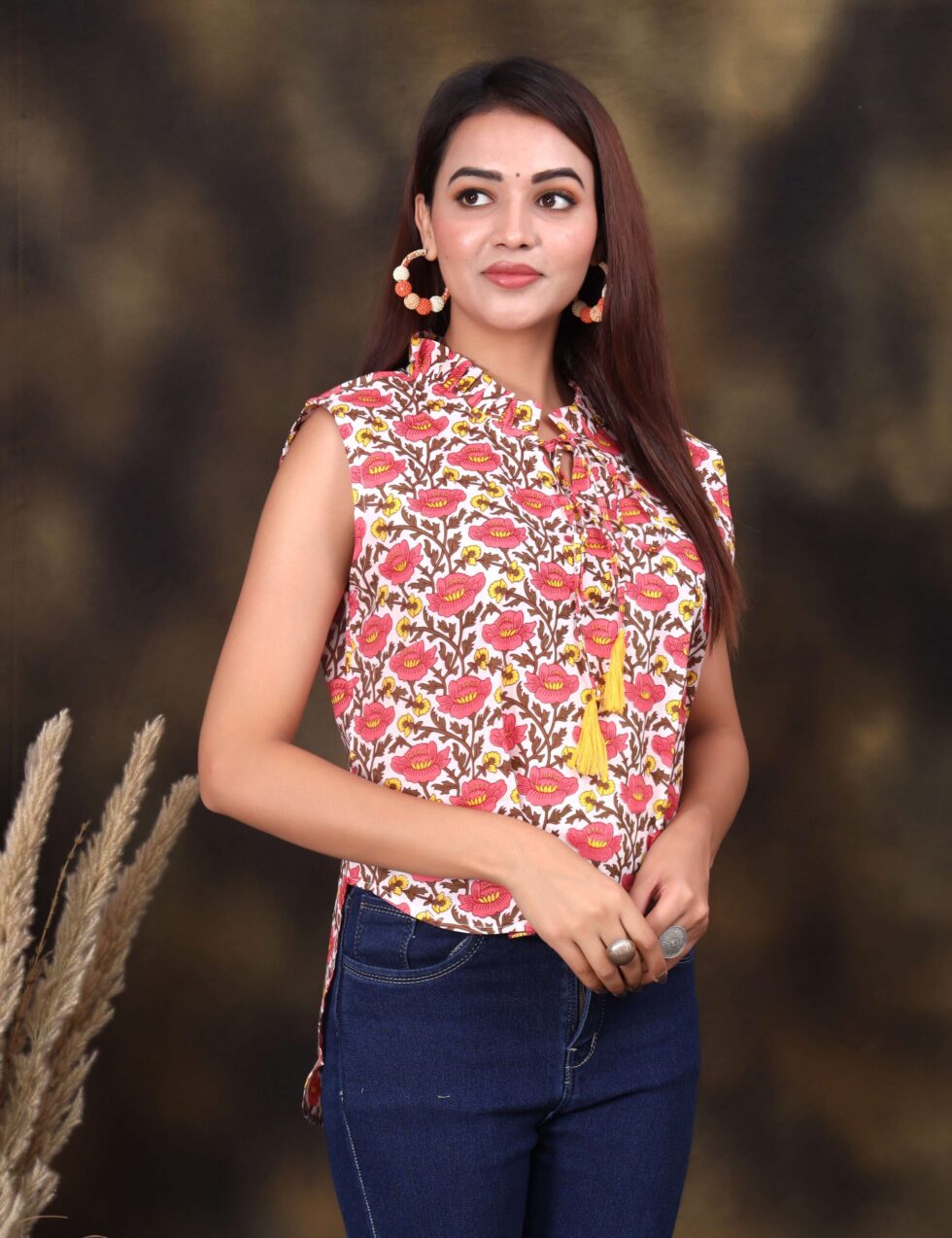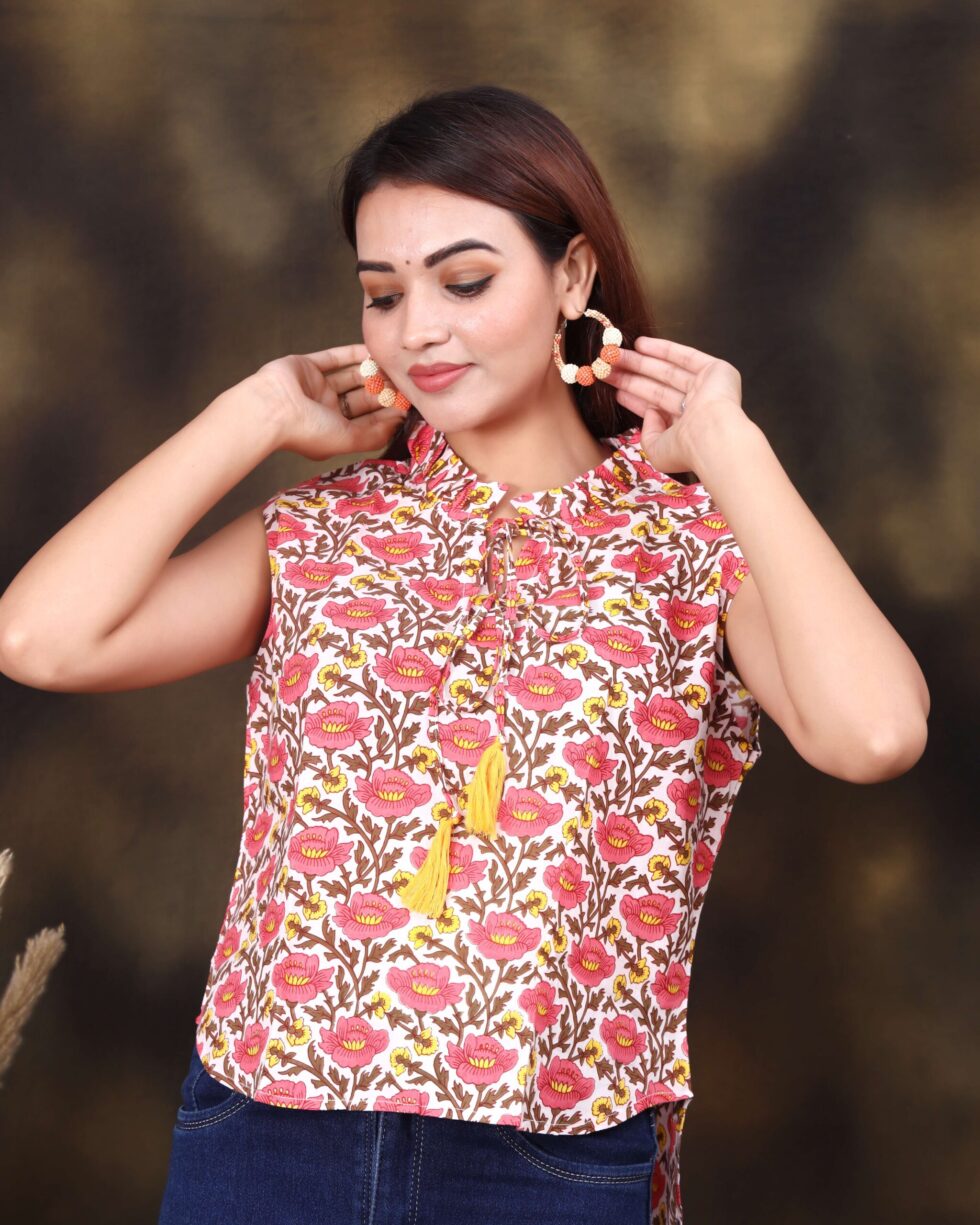 floral printed sleeveless cotton top for women, designed for comfort and style. Featuring a vibrant multicolor flower pattern, tassel tie-up neckline, and soft breathable fabric, this top is perfect for casual outings, office wear, or summer gatherings. Pair it with jeans, trousers, or skirts for a chic everyday look. A must-have trendy women?s top for those who love effortless fashion.