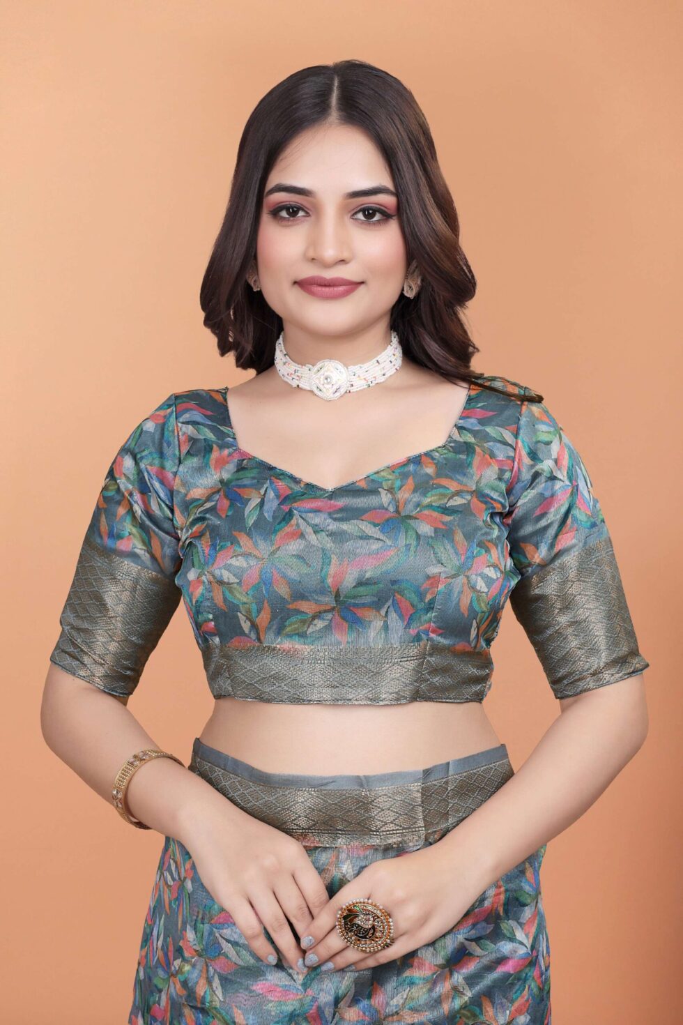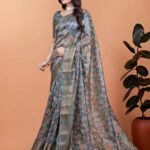 This elegant grey saree showcases a delightful all-over multicolor leaf pattern, creating a graceful and vibrant look. The highlight is its eye-catching pallu with bold ethnic motifs and delicate tassel detailing that adds a festive charm.