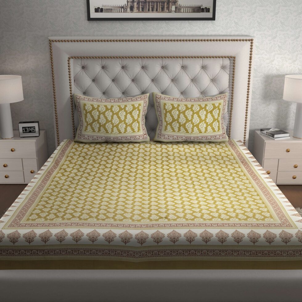 Enhance your bedroom décor with this Jaipuri Cotton Printed Double Bedsheet. Crafted from 100% pure cotton, it offers softness, breathability, and elegant traditional prints for a comfortable and stylish look. Comes with two matching pillow covers.