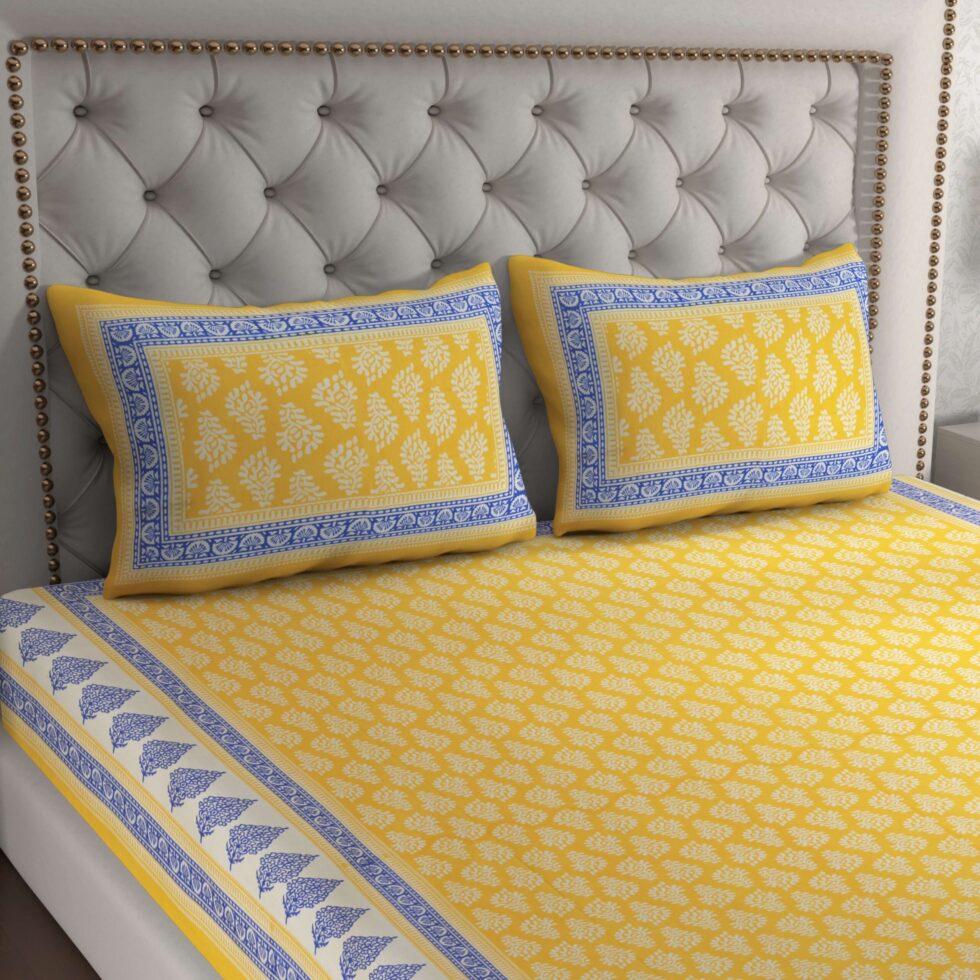 Enhance your bedroom décor with this Jaipuri Cotton Printed Double Bedsheet. Crafted from 100% pure cotton, it offers softness, breathability, and elegant traditional prints for a comfortable and stylish look. Comes with two matching pillow covers.