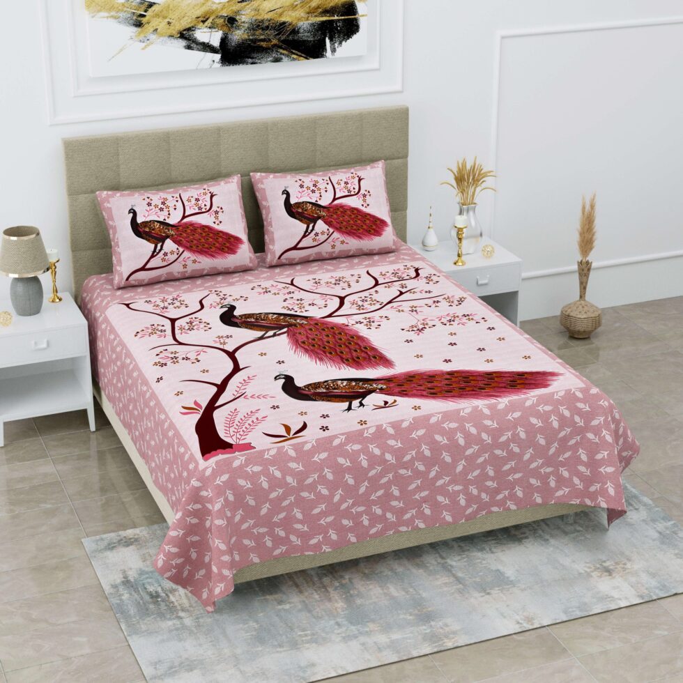 Jaipuri Peacock Printed 100% Pure Cotton Double Bedsheet With Two Pillow Cover (Multi-Color)