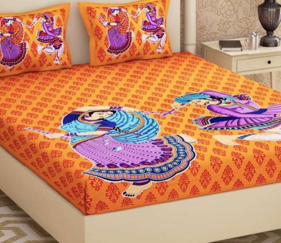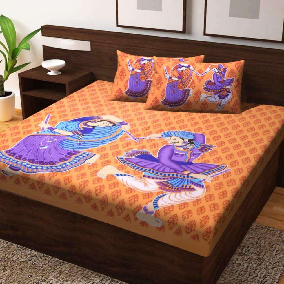 Jaipuri Printed Double Bedsheet With Two Pillow Cover Featuring A Traditional Rajasthani Dandiya Dance Design (Orange)