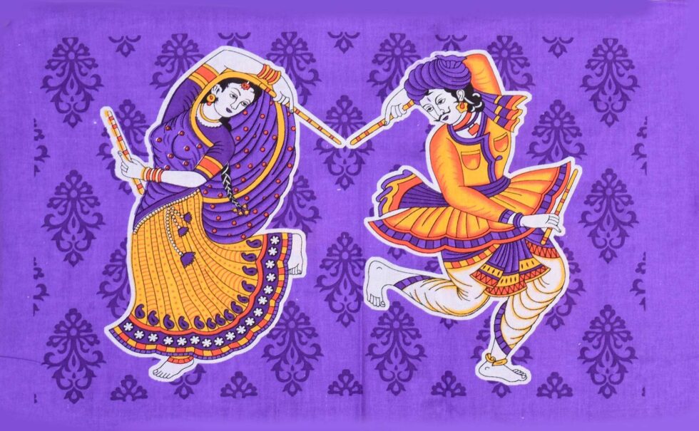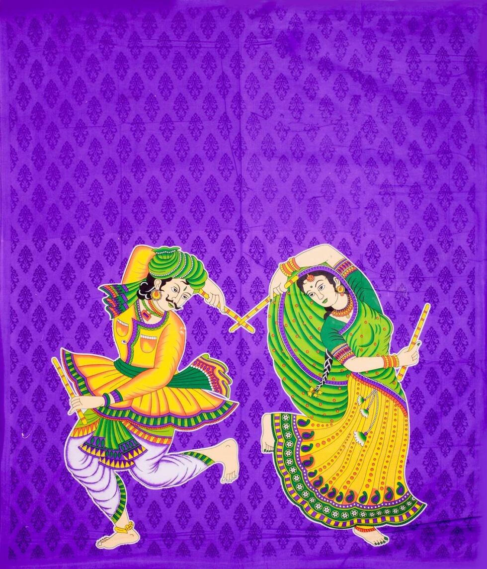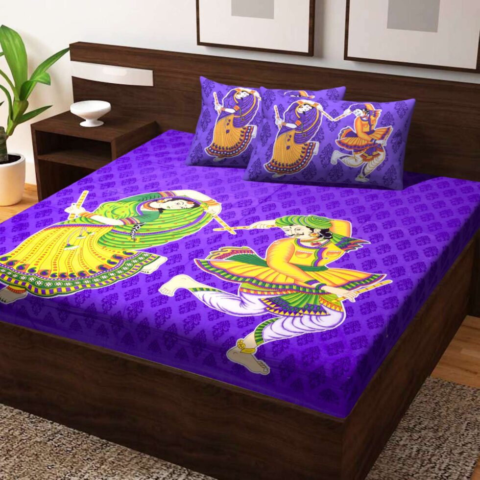 Jaipuri Printed Double Bedsheet With Two Pillow Cover Featuring A Traditional Rajasthani Dandiya Dance Design (Purple)