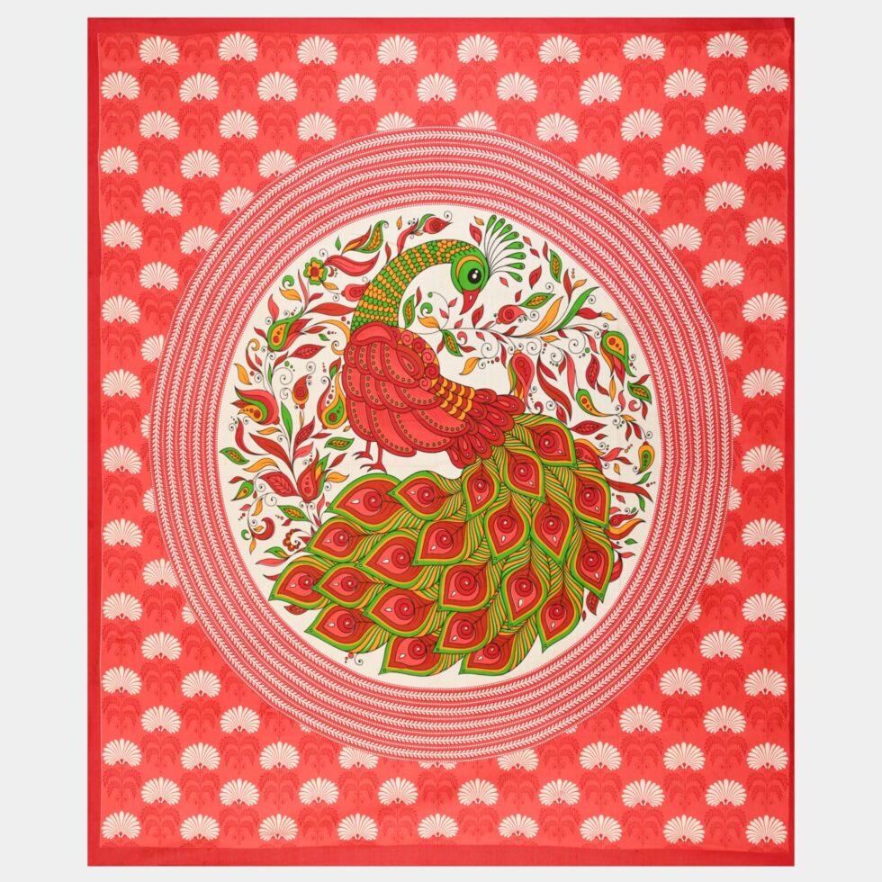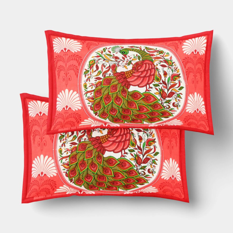 Jaipuri Stylish Peacock Printed Double Bed Bedsheet With Two Pillow Cover (Peach-Colored)