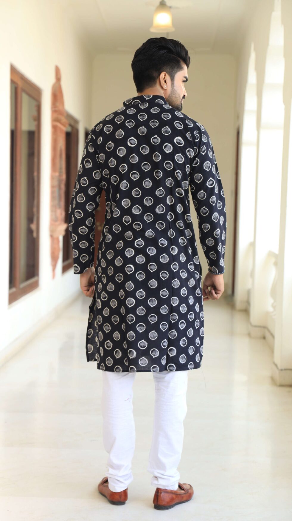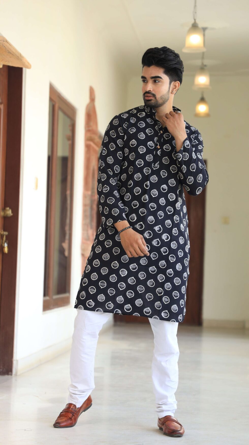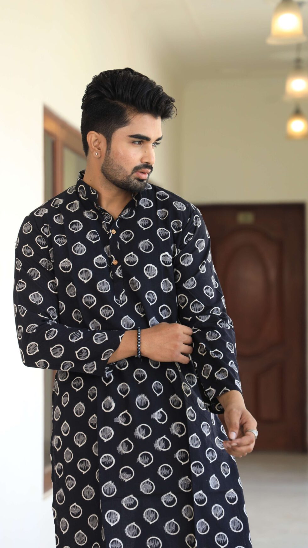 stylish Black printed cotton kurta set for men, paired Black with classic white pajama pants. Designed with a comfortable fit and elegant detailing, this kurta is perfect for festivals, weddings, parties, pooja ceremonies, and cultural celebrations. The breathable cotton fabric ensures comfort, while the subtle printed motifs add a touch of sophistication. Pair it with leather sandals or juttis to complete your traditional look.