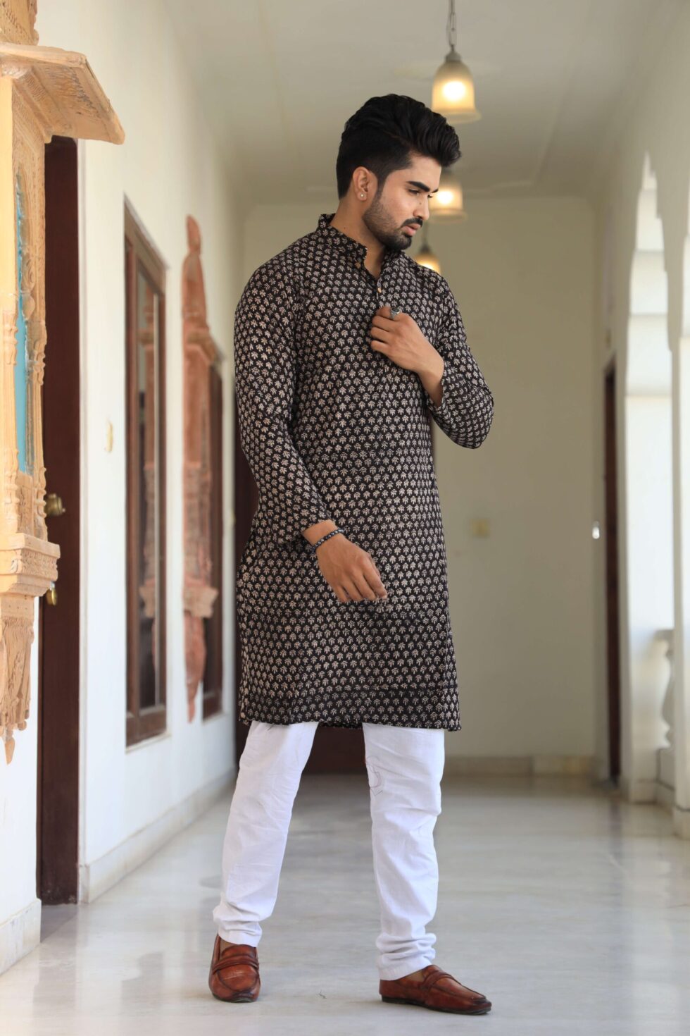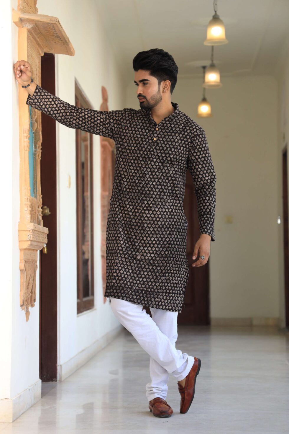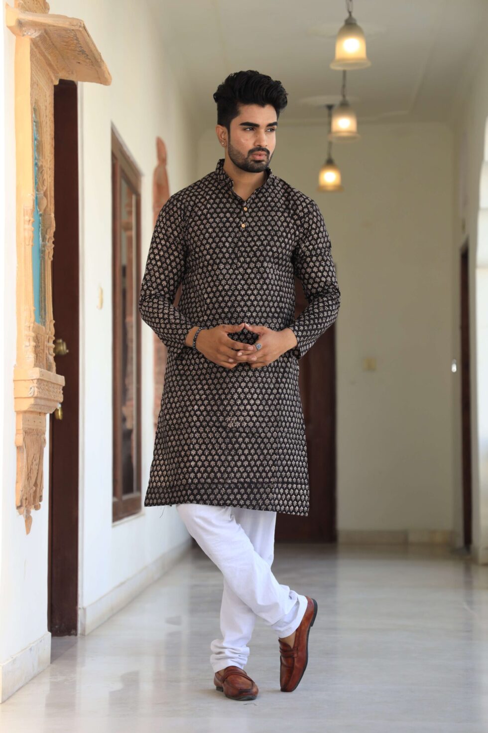 Elegant Festive Wear ? Black printed cotton kurta with white pajama, perfect for weddings, parties, and poojas.