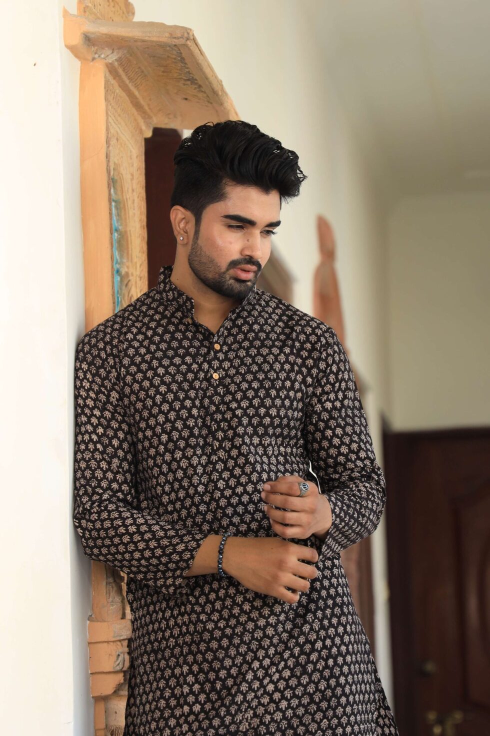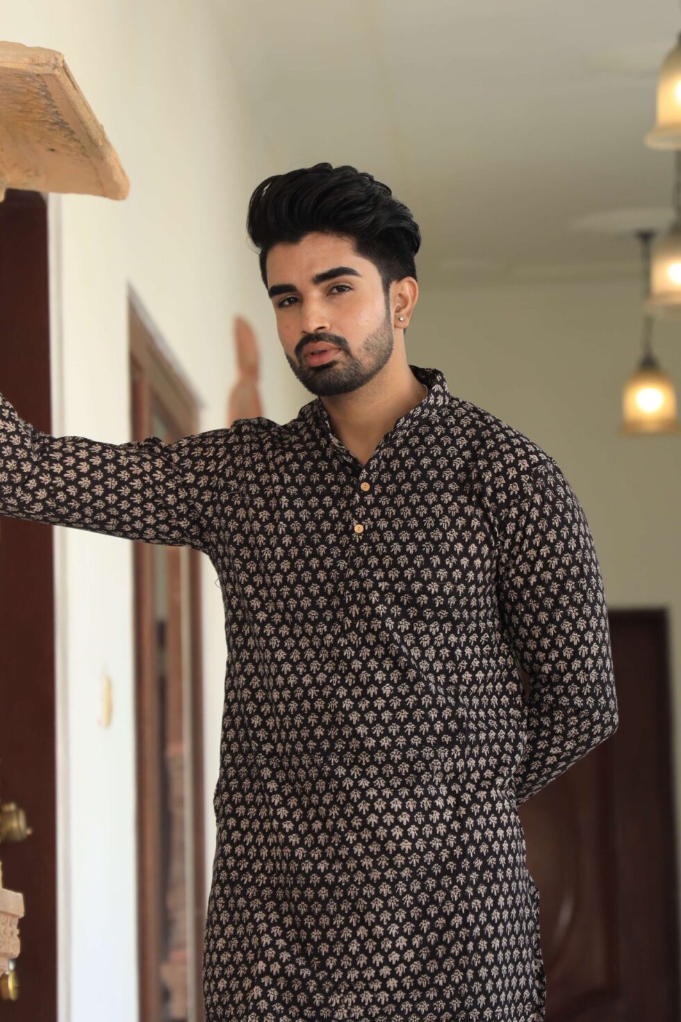 stylish Black printed cotton kurta set for men, paired Black with classic white pajama pants. Designed with a comfortable fit and elegant detailing, this kurta is perfect for festivals, weddings, parties, pooja ceremonies, and cultural celebrations. The breathable cotton fabric ensures comfort, while the subtle printed motifs add a touch of sophistication. Pair it with leather sandals or juttis to complete your traditional look.