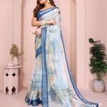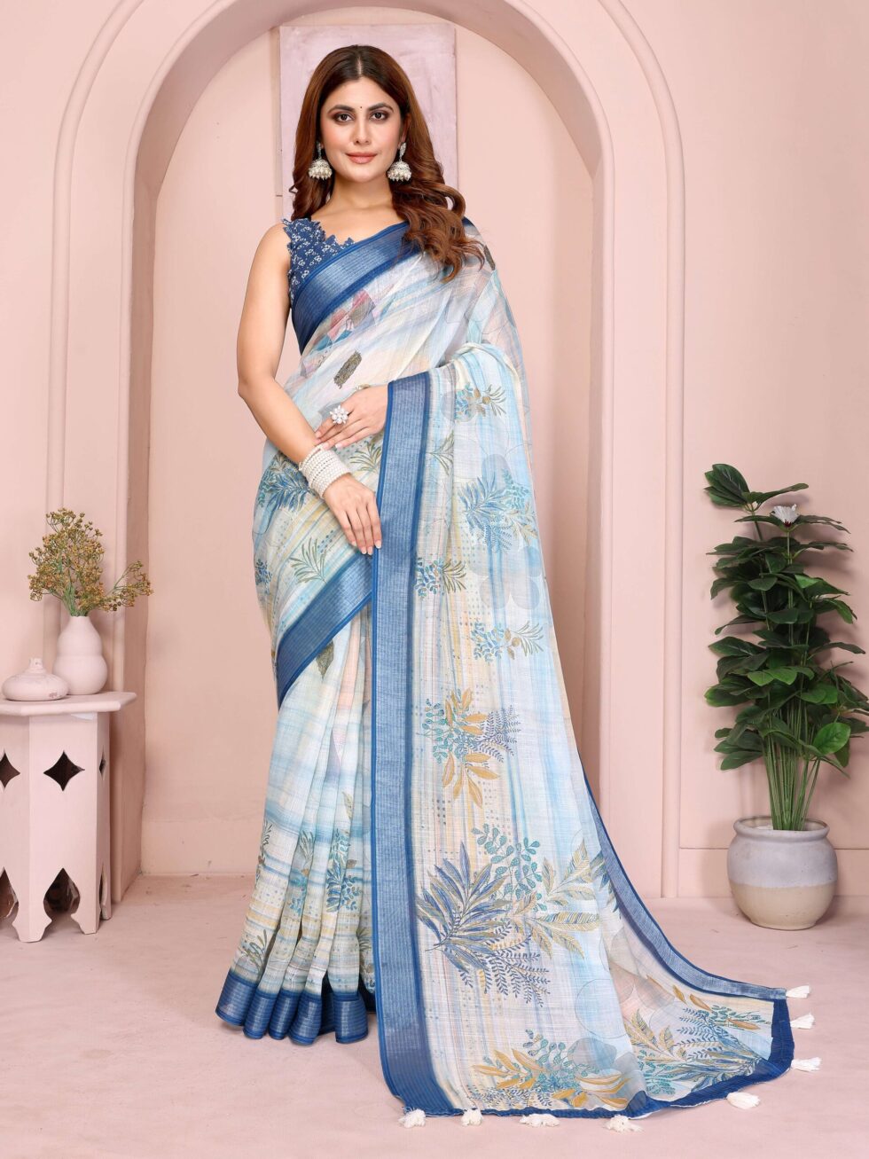 Refresh your wardrobe with this pastel blue linen cotton saree, adorned with tropical leaf motifs, a deep blue textured border, and white tassel-accented pallu — perfect for festive, casual, or office wear.