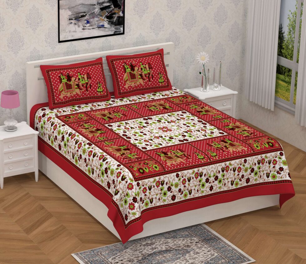 Enhance your bedroom décor with this Jaipuri Cotton Printed Double Bedsheet. Crafted from 100% pure cotton, it offers softness, breathability, and elegant traditional prints for a comfortable and stylish look. Comes with two matching pillow covers.