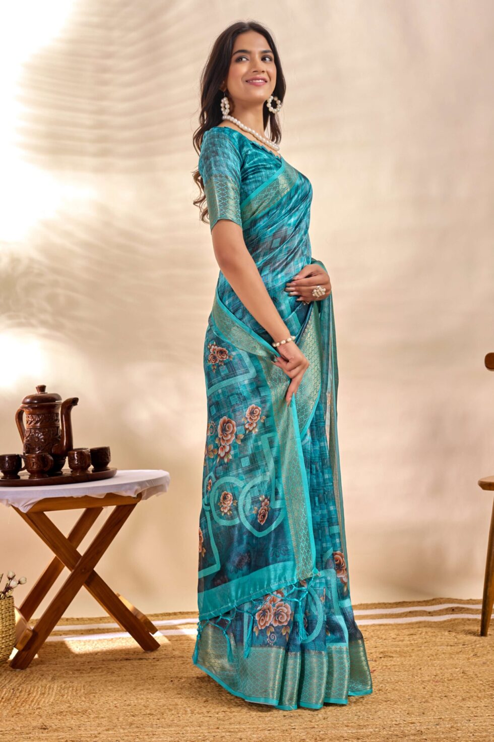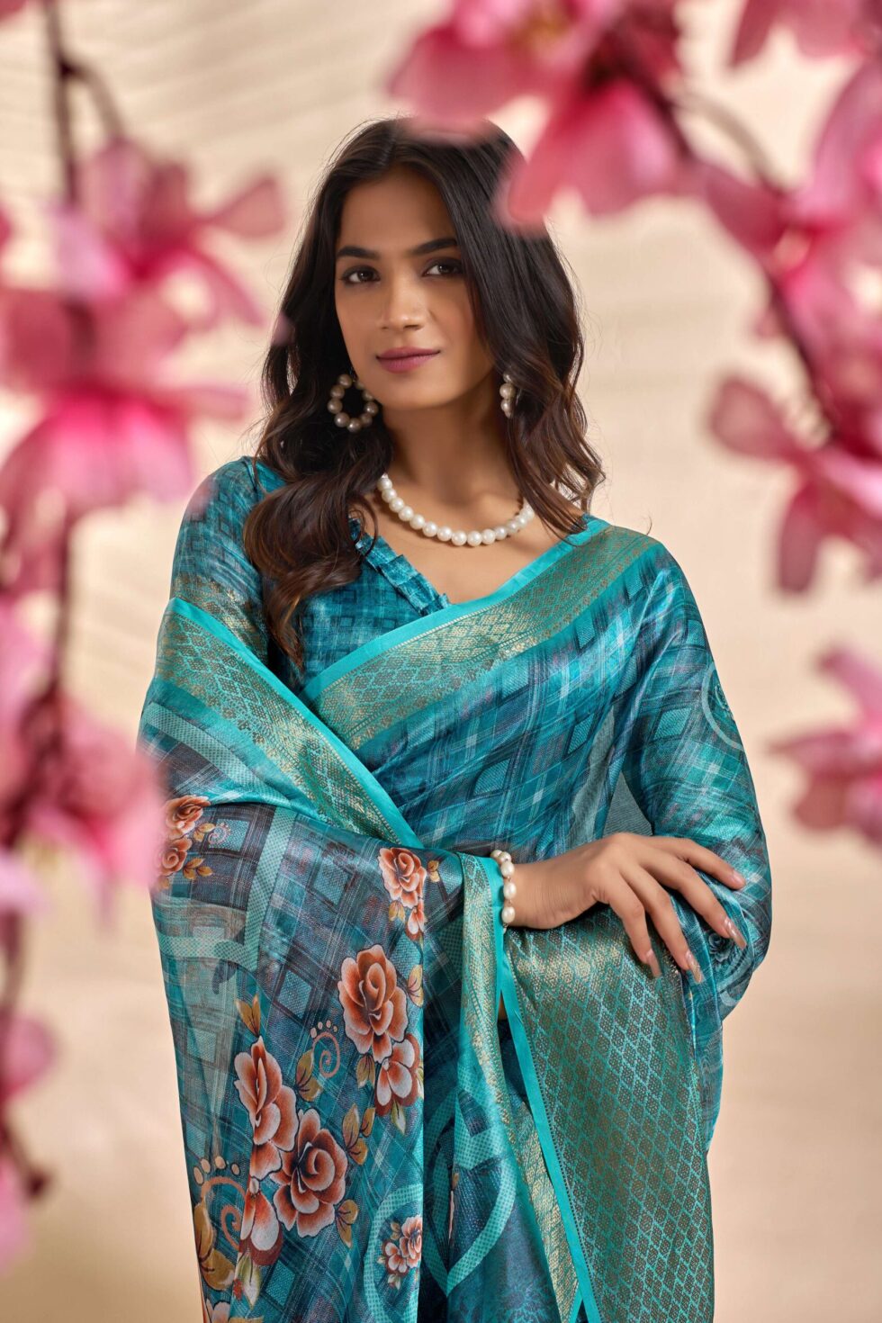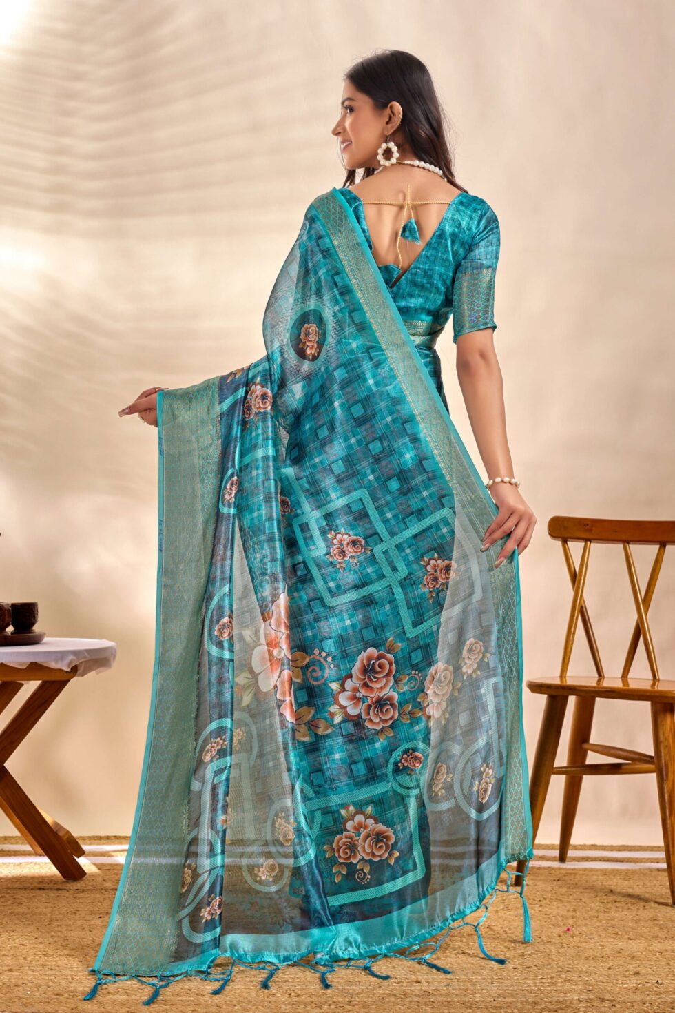 This elegant teal blue soft silk saree features a unique checkered weave adorned with beautifully placed floral digital prints. The pallu is enriched with striking rose motifs framed in intricate patterns, creating a graceful blend of tradition and modern aesthetics.