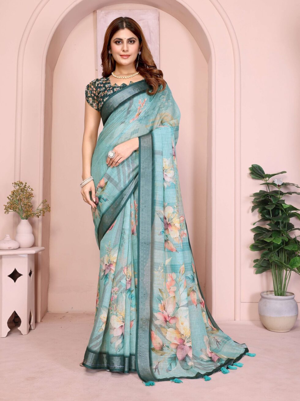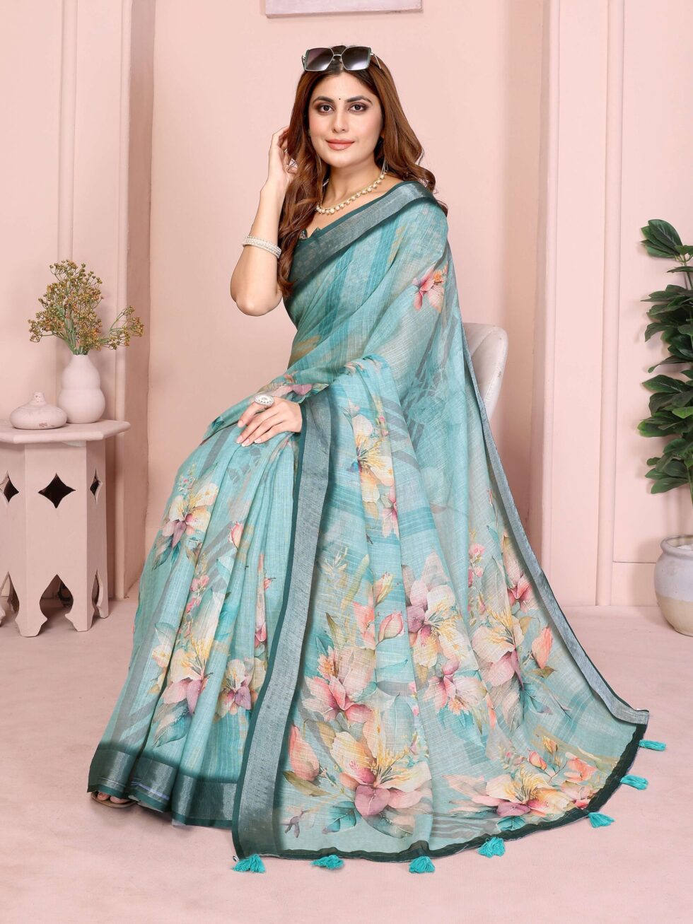 Elegant and breezy, this teal green linen cotton saree features soft watercolor floral prints, a deep green woven border with tassels, and a matching blouse piece ? perfect for casual, office, or light festive wear.