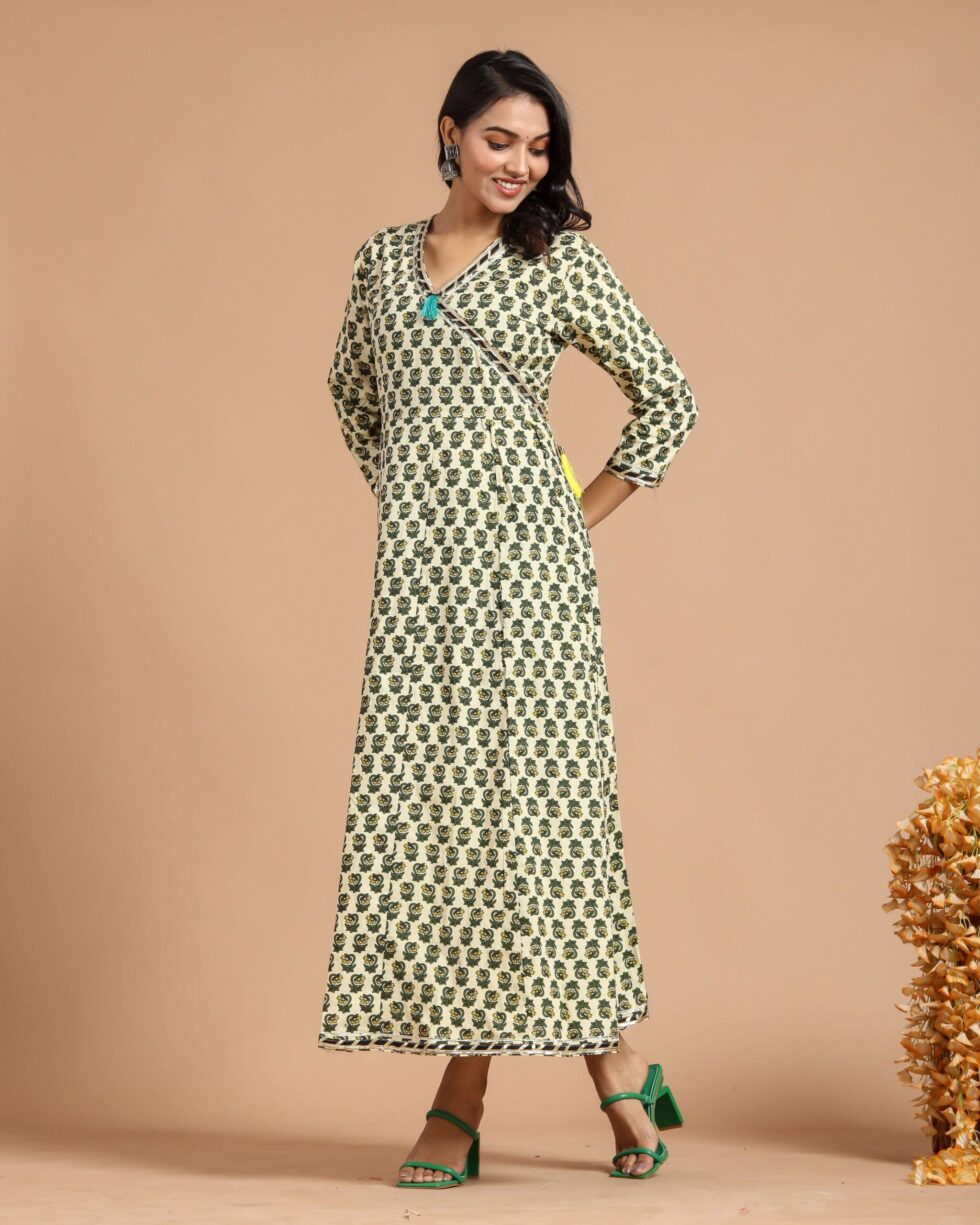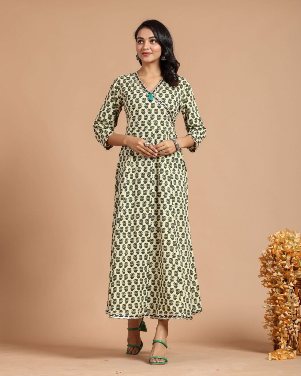 White And Grey Printed Anarkali Maxi Dress with Wrap Style V-Neck & 3/4 Sleeves