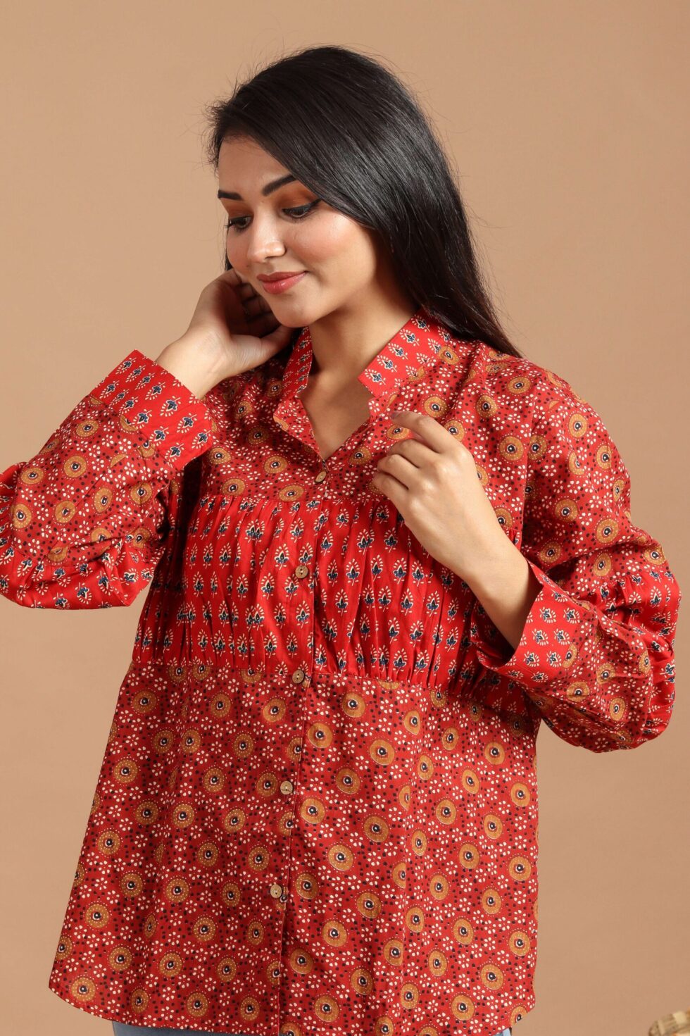 Red printed sleeveless top for women, crafted from soft breathable fabric. Featuring a trendy tie-up neckline with tassels, this modern top is perfect for casual wear, office styling, or weekend outings. Its monochrome pattern adds a chic touch, making it easy to pair with jeans, trousers, or skirts for a versatile look.