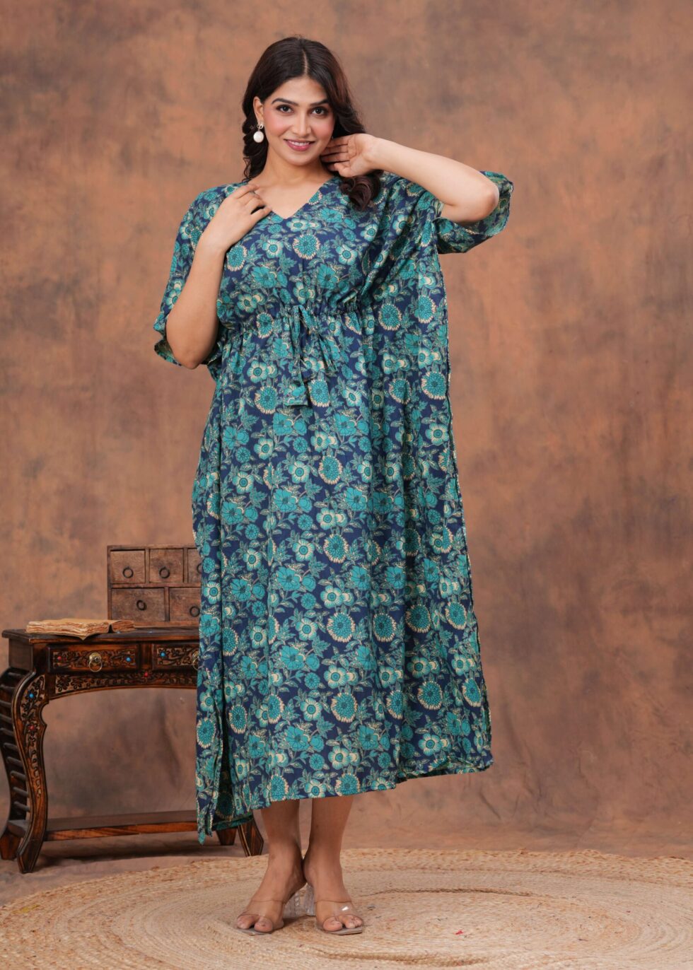 Women’s Blue Cotton Floral Printed Kaftan Dress with Drawstring Waist