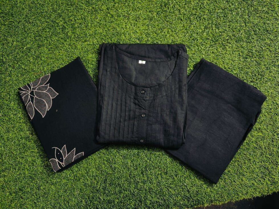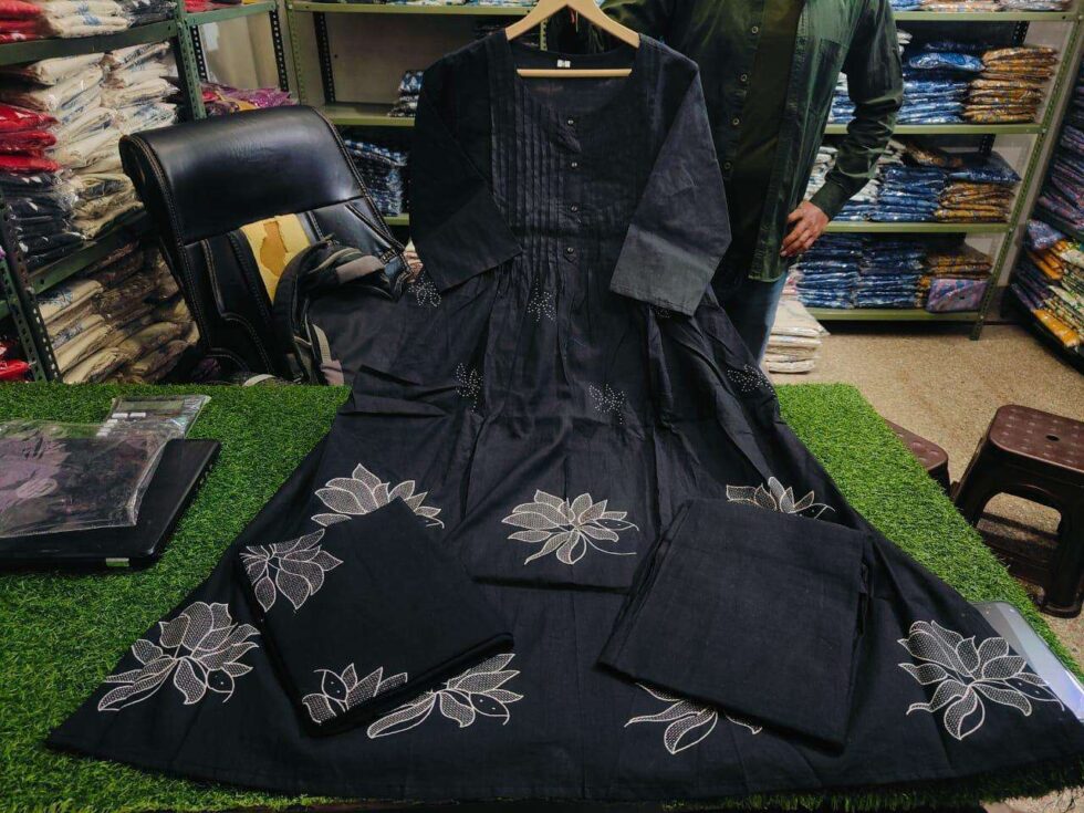 Women’s Cotton Embroidery Floral Printed Long Straight Kurti With Pant And Dupatta Set
