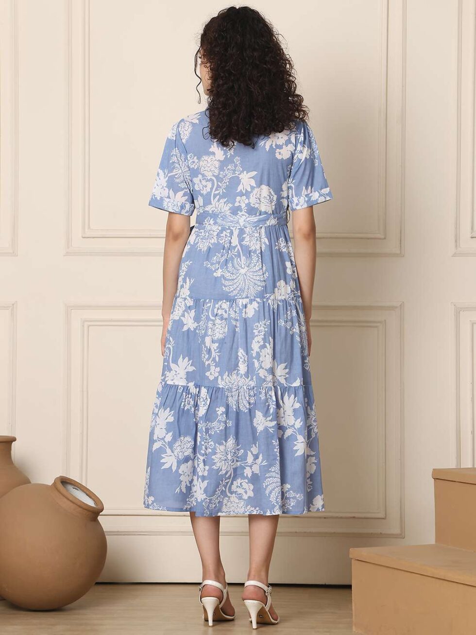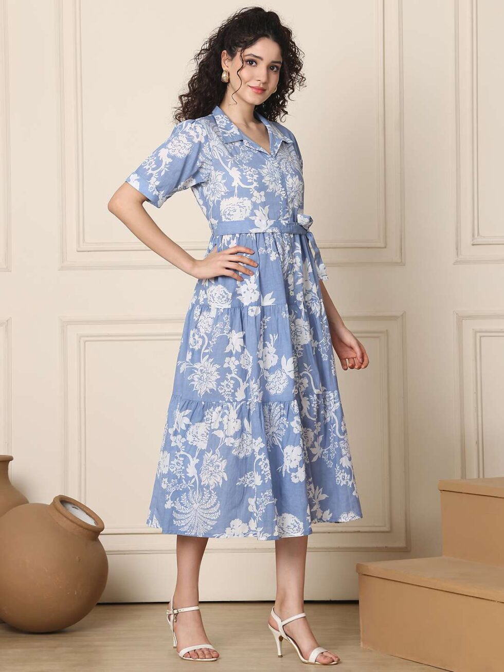 Women’s Cotton Printed A-Line Midi Dress | Short Sleeve Flared Gown Dress (Sky Blue)