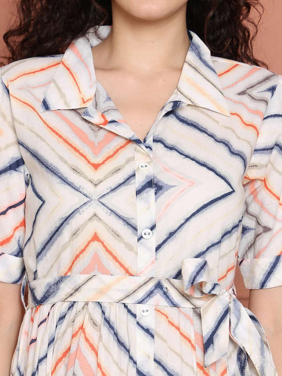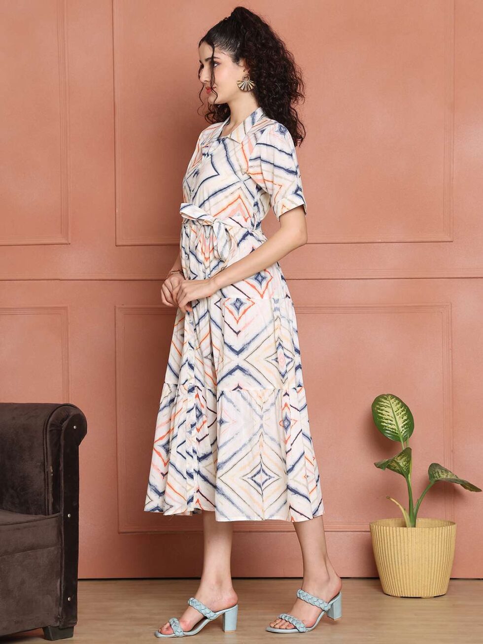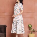 Women’s Cotton Printed A-Line Midi Dress | Short Sleeve Flared Gown Dress (White)