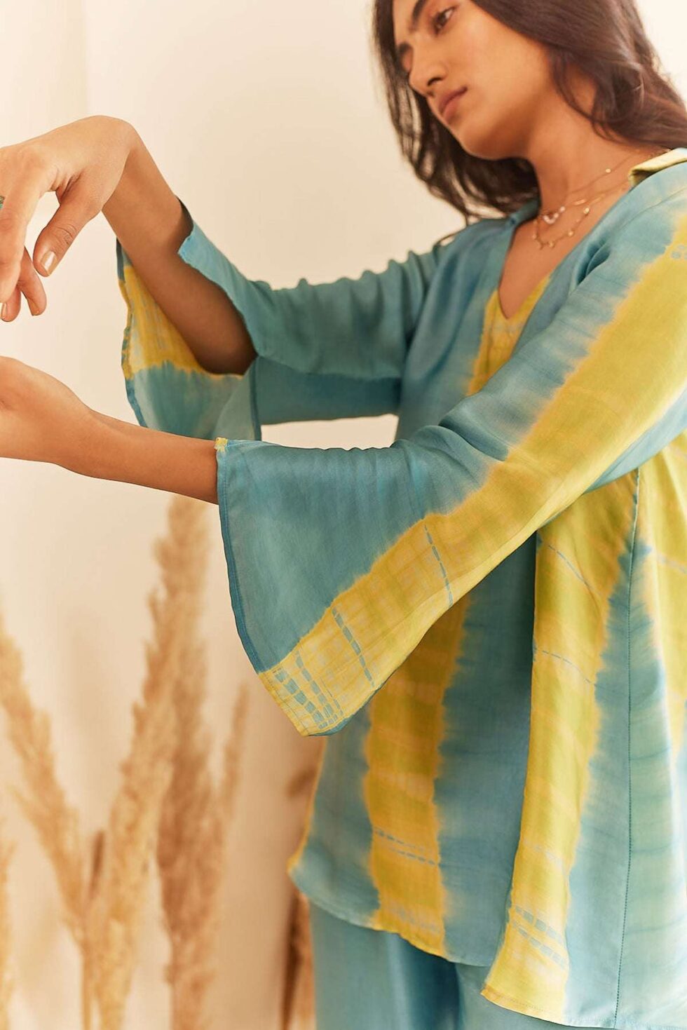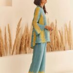 Women’s Cotton Tie Dye Print Two-Piece Lounge Set Tunic with Wide-Leg Pants, Resort Wear ( Teal and Yellow )