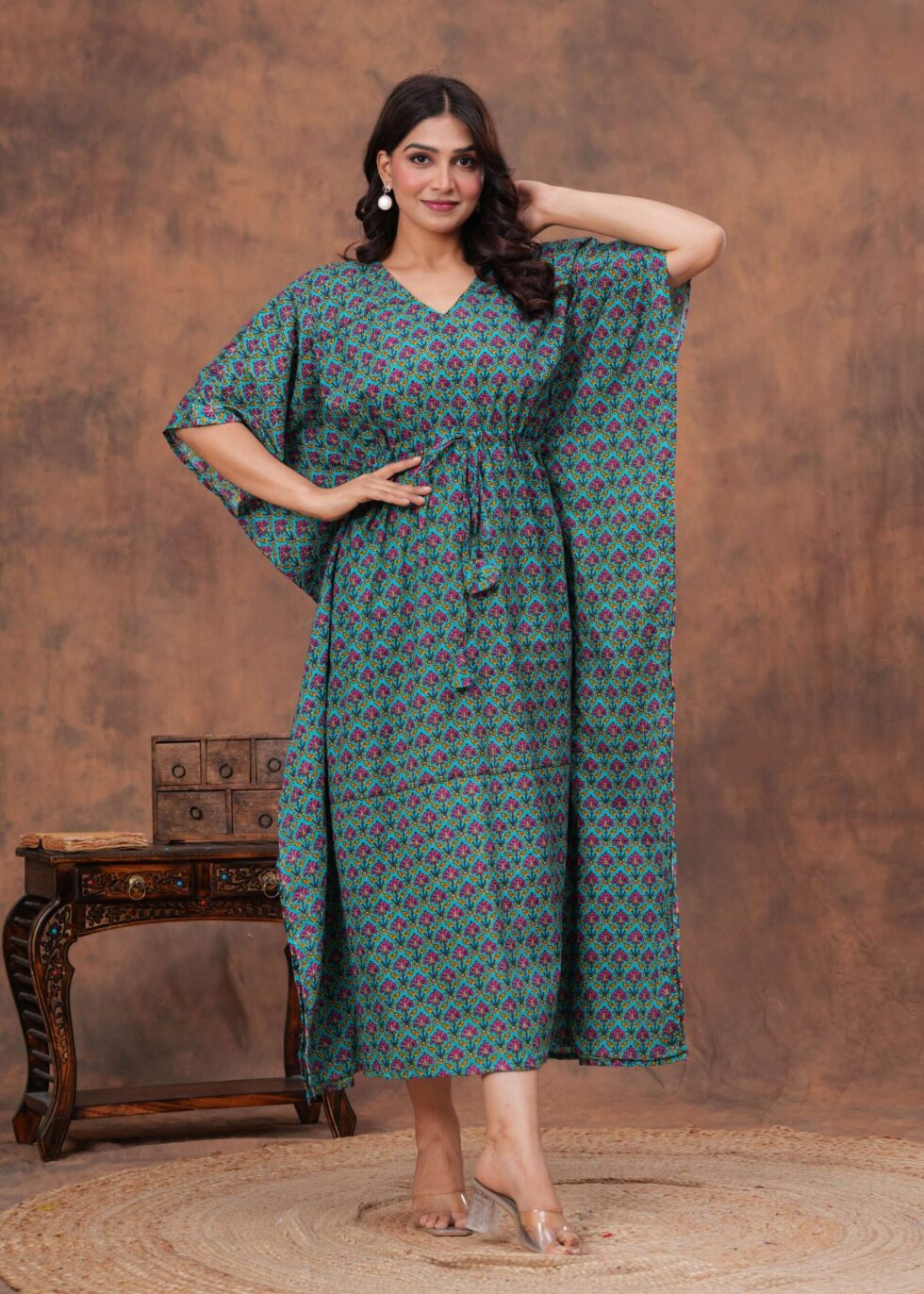 Stylish cotton kaftan dress with soft breathable fabric, adjustable drawstring waist, and relaxed fit. Perfect for casual outings, vacations, or lounging in comfort.