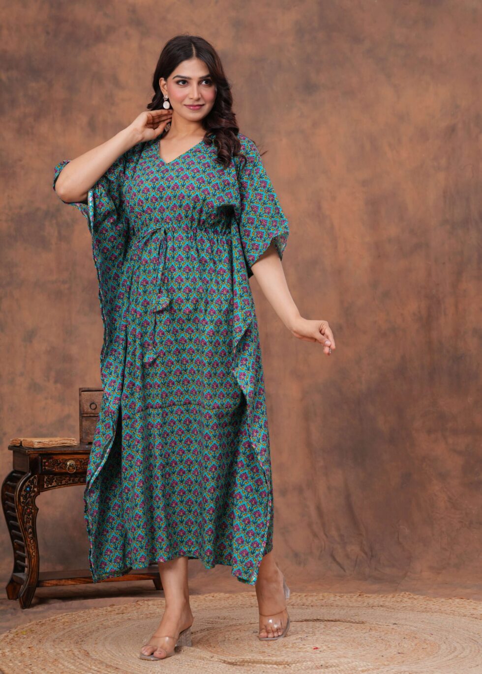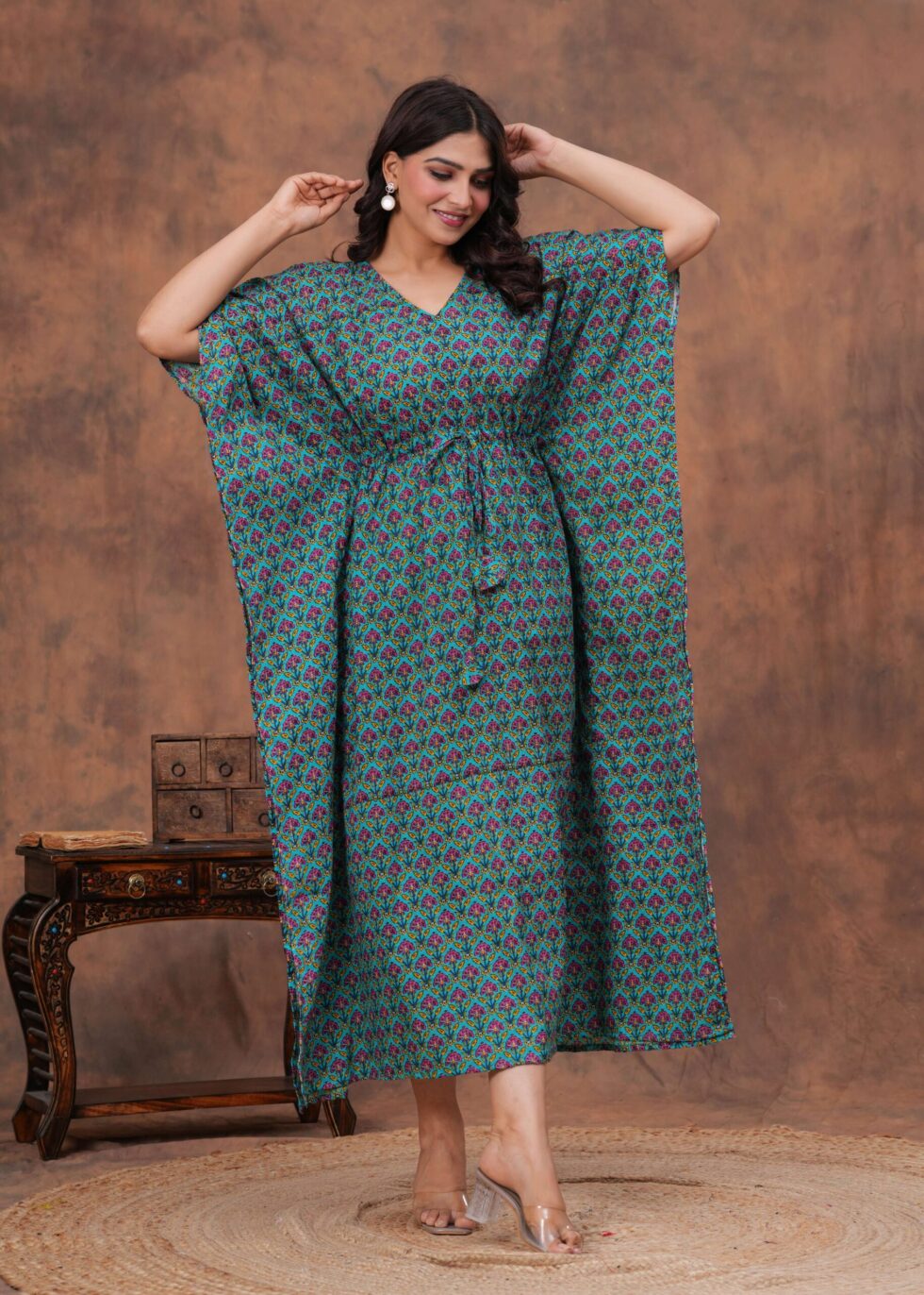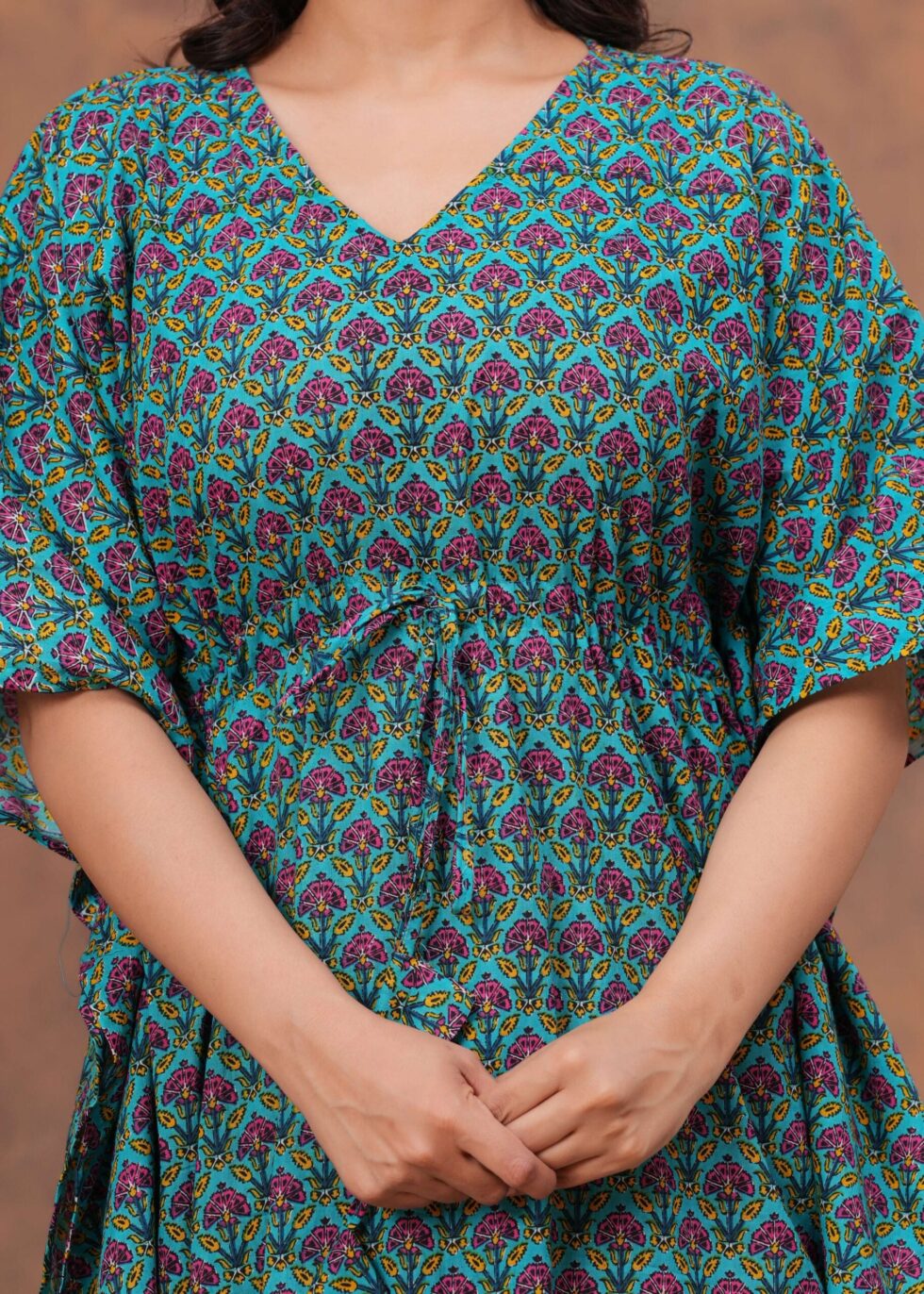 Elevate your everyday style with this beautifully crafted cotton kaftan dress. Designed for comfort and elegance, it features a soft breathable fabric that feels gentle on the skin, making it perfect for all-day wear. The relaxed fit is enhanced with a drawstring waist, allowing you to adjust the silhouette for a flattering look. With its stylish print and flowing design, this kaftan is ideal for lounging at home, casual outings, or vacation wear.