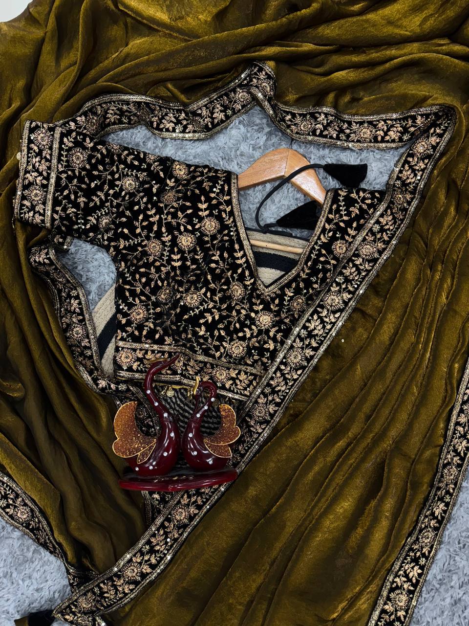Women’s Luxe Olive-Gold Silk Saree with Heavily Embellished Blouse & Border β Ideal for Evening, Wedding & Reception Wear