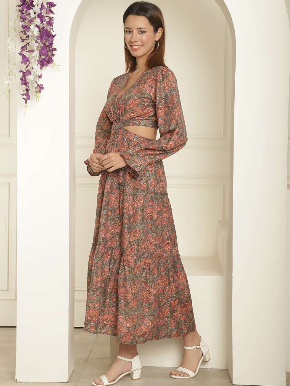 Women’s Silk Printed V-Neck Long Bell Sleeves Tiered Maxi Dress Gown (Brown)