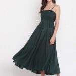Women’s Viscose Rayon Solid Shoulder Straps Sleeveless Flared Gown Drees (Green1)