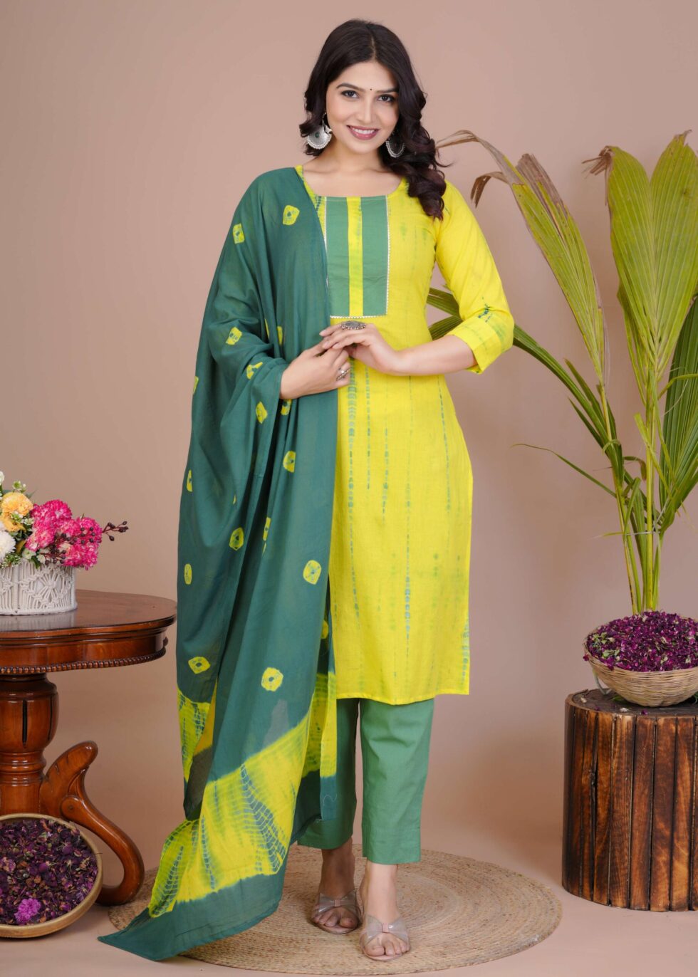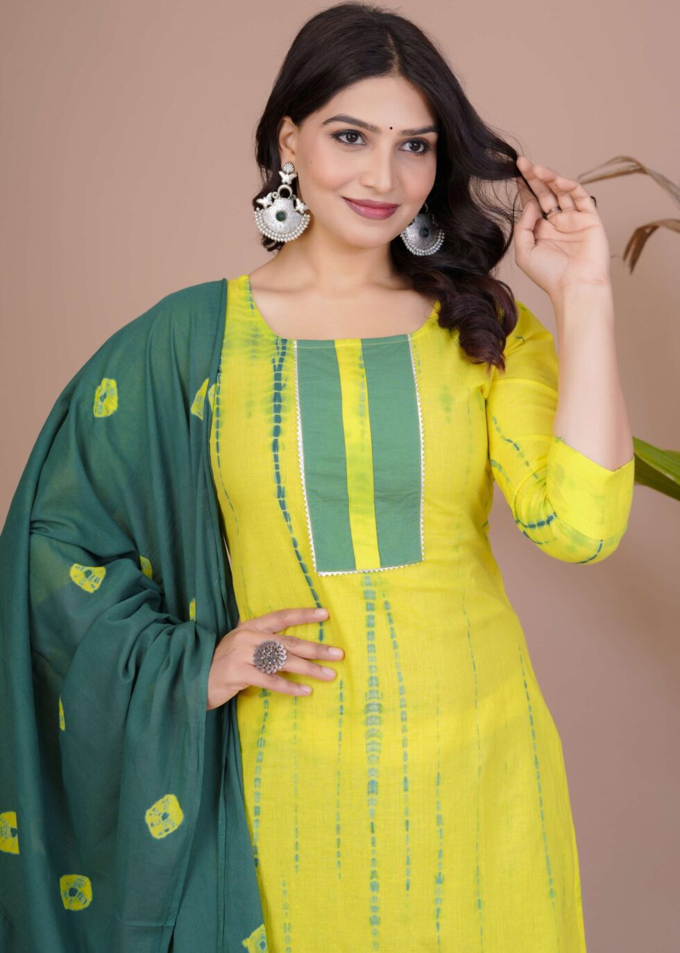 Women’s Yellow & Green Cotton Tie-Dye Straight Kurti with Pant & Dupatta Set