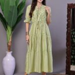 Wome’s Boho-Chic Forest Green Tiered Maxi Dress with Puff Sleeves Dresses